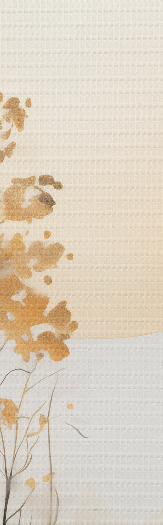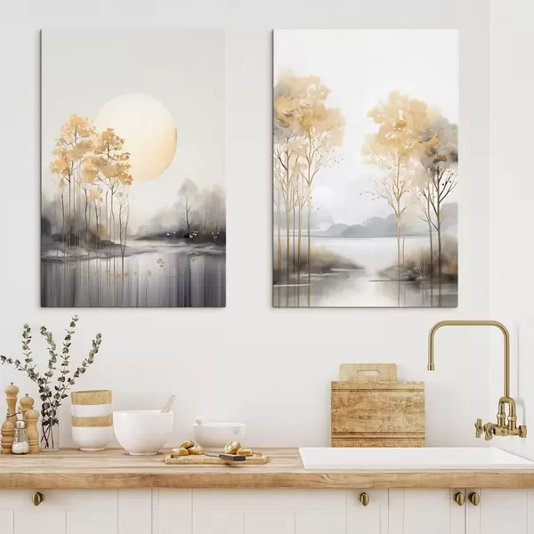Vászonkép Dekoratív absztrakt táj, magas fák sárga levelekkel, folyó és köd a háttérben Nr m01115