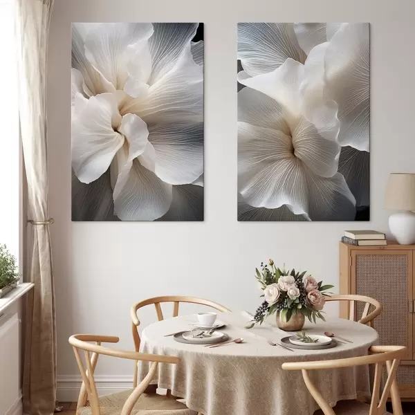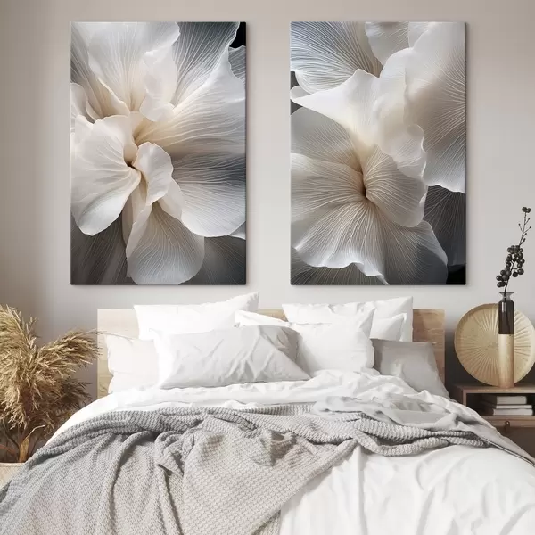 Vászonkép Közelkép finom, absztrakt fehér virágszirmokról, bonyolult vonalakkal és elmosódott sötét háttérrel Nr m01117