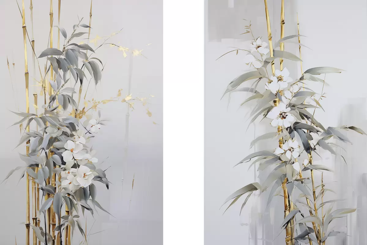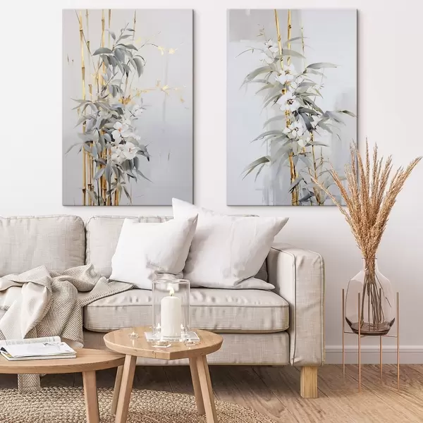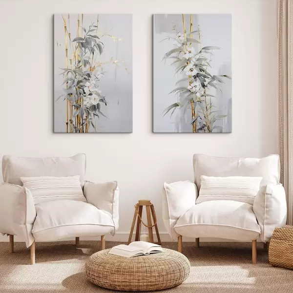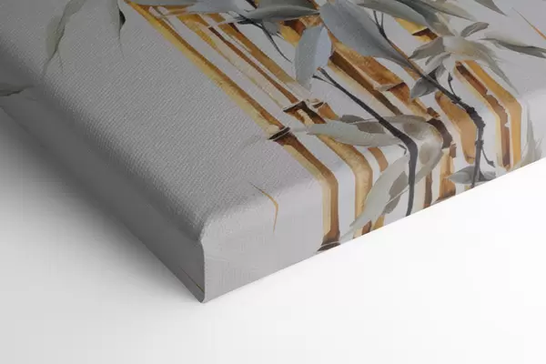 Vászonkép Absztrakt bambuszszárak sárga akcentussal, finom fehér virágokkal és halványzöld levelekkel, szürke háttérrel Nr m01127