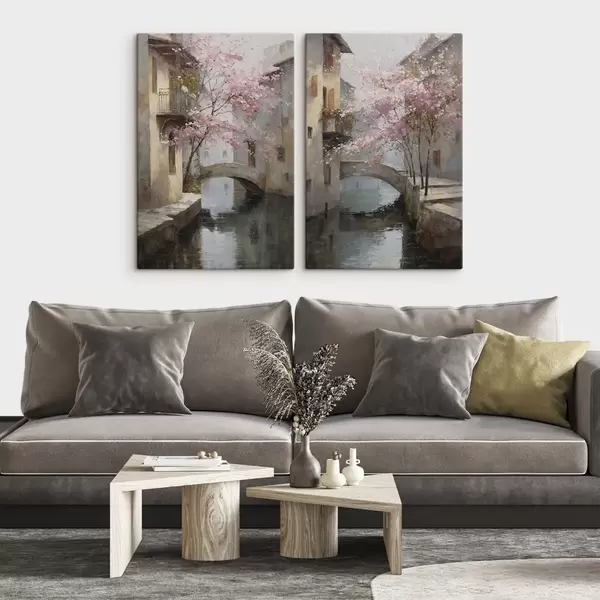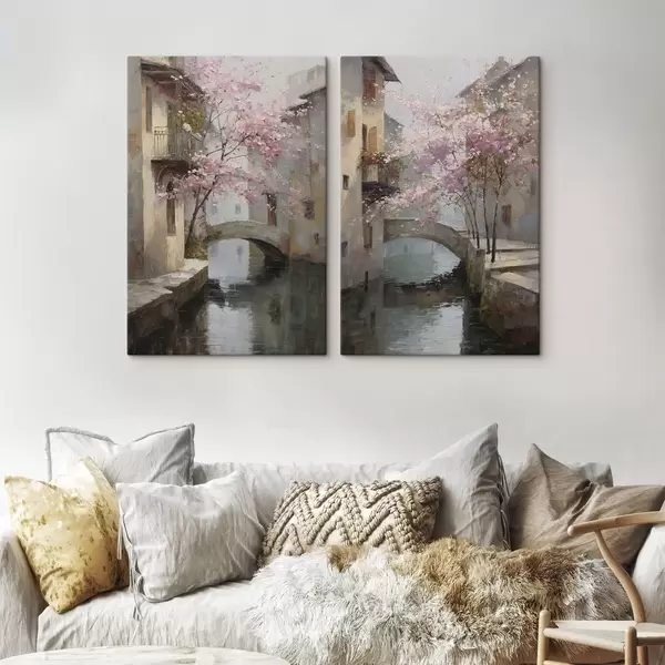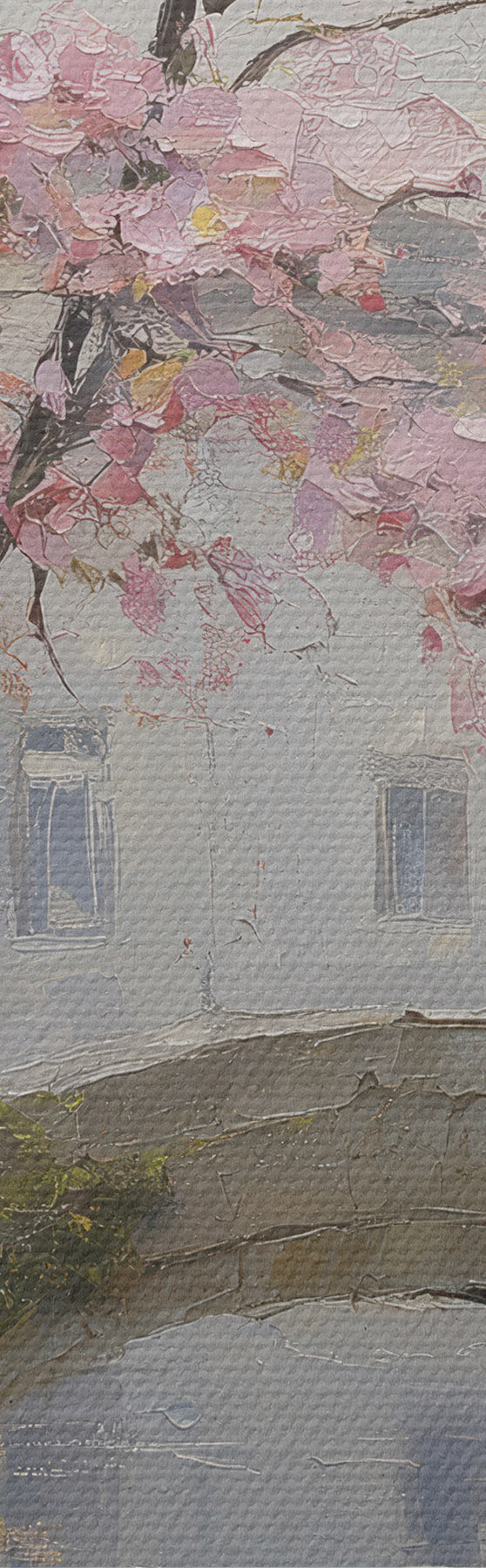 Vászonkép romantikus városi tájkép virágzó fával, olajfestmény stílusban Nr m01173