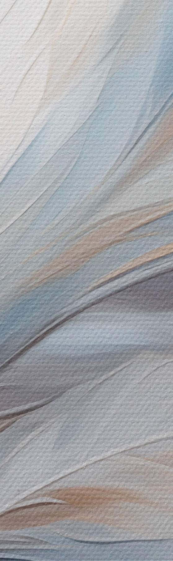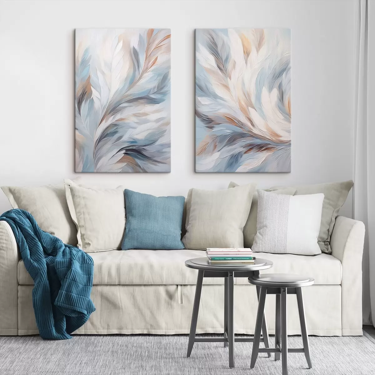 Vászonkép Absztrakt festmény fehér, kék és barna árnyalatú tollakról, puha, áramló textúrával és világos háttérrel. Nr m01234
