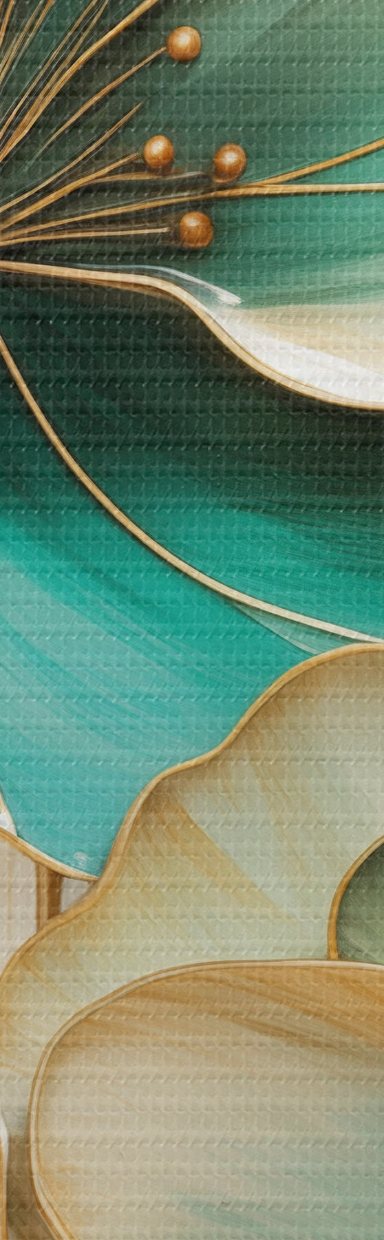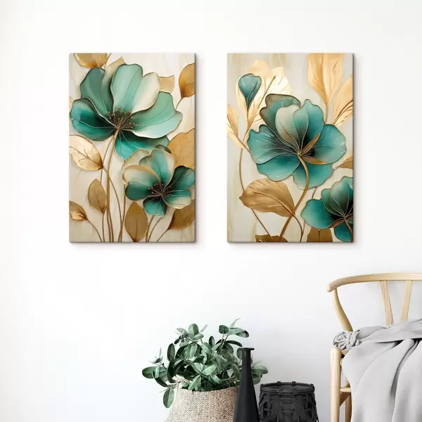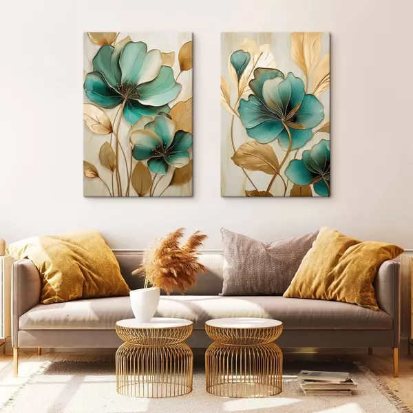 Vászonkép Nagy, kontúrokkal ellátott, kékes-zöld és sárga virágok, sárga levelekkel körülvéve, absztrakt háttér előtt Nr m01235