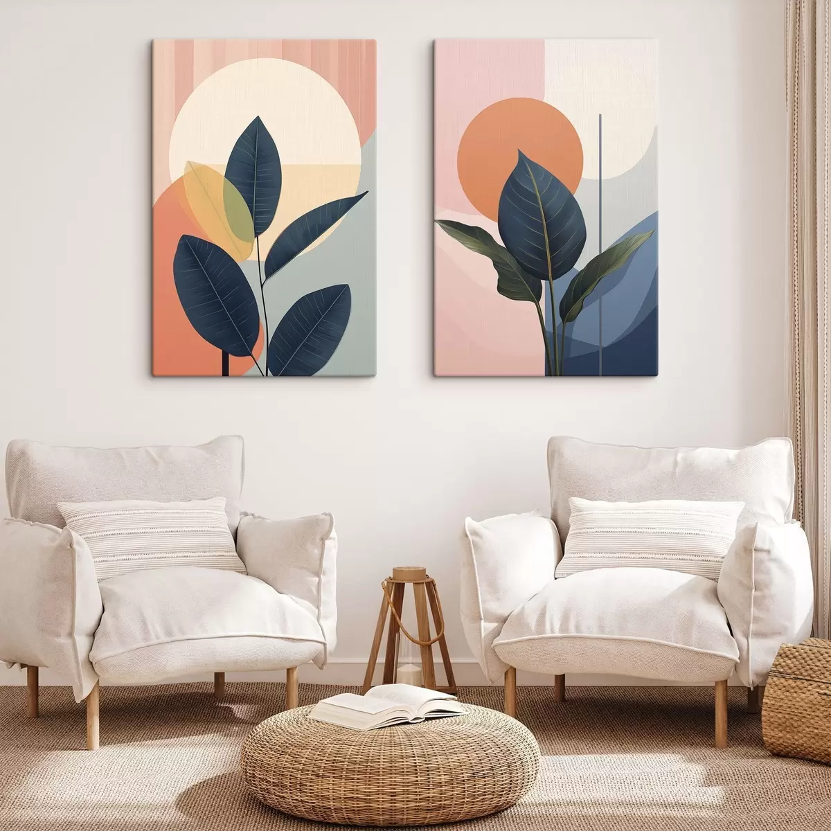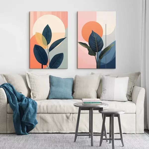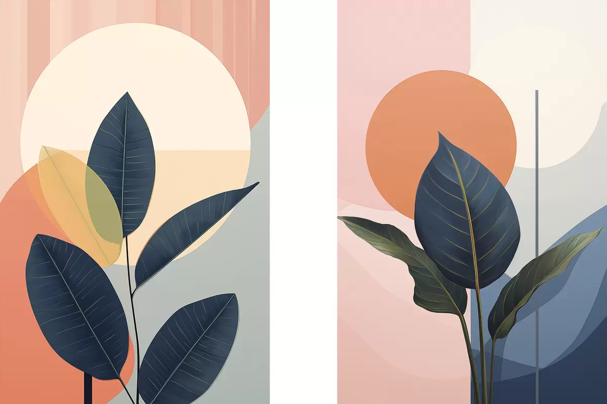 Vászonkép Sötét levelek absztrakt formákkal tarkított barack- és szürkés háttér előtt, nagy, halványsárga körrel Nr m01238