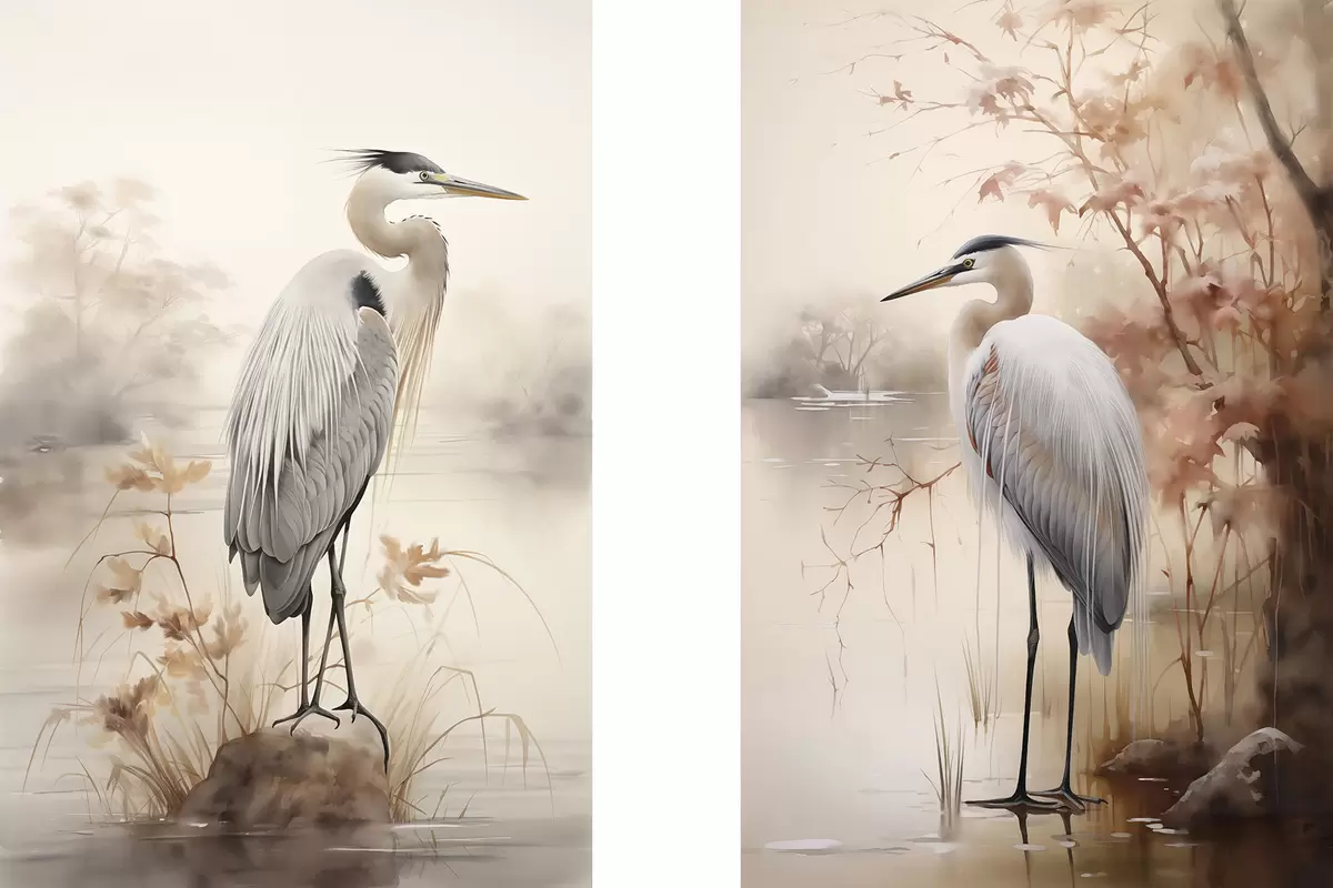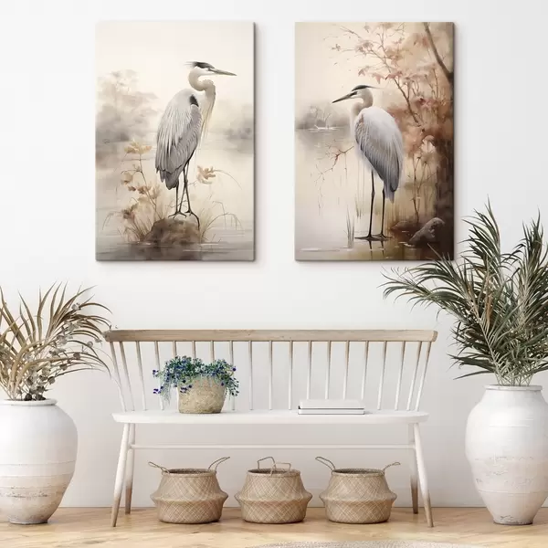 Vászonkép Egy gém áll egy sziklán egy tóban, magas fű és fákkal a háttérben. Nr m01239