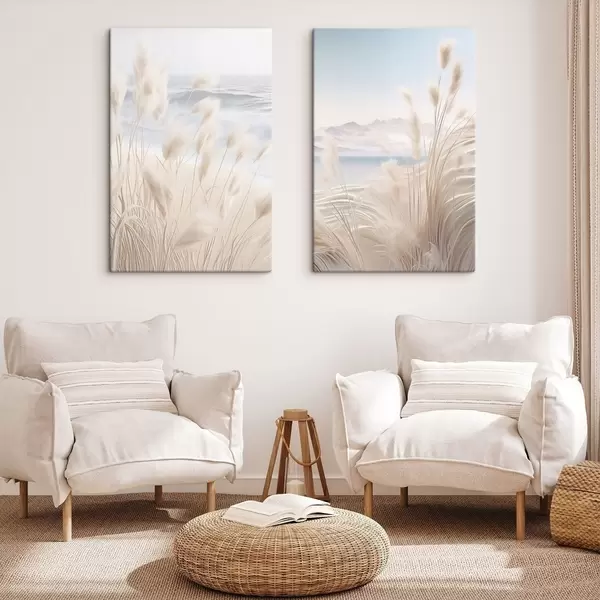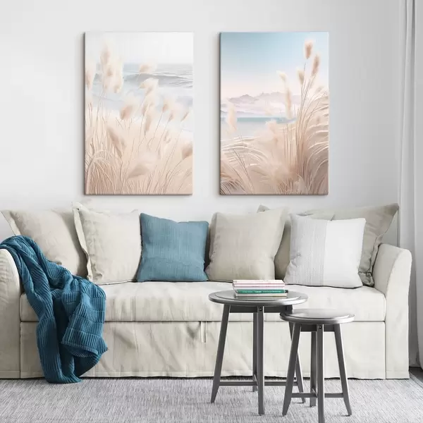 Vászonkép Magas, tollas pampas fű lágy bézs árnyalatokban az előtérben, homokos stranddal a háttérben Nr m01242