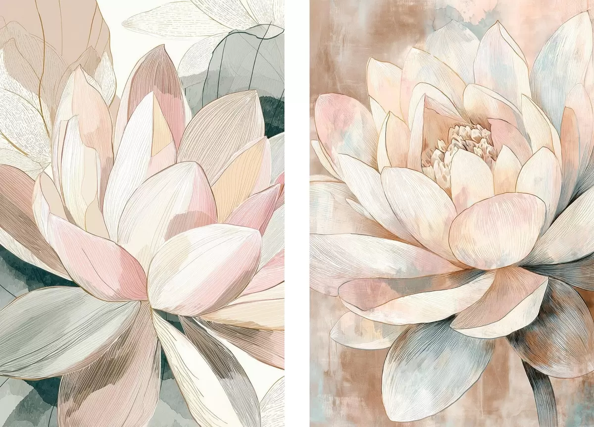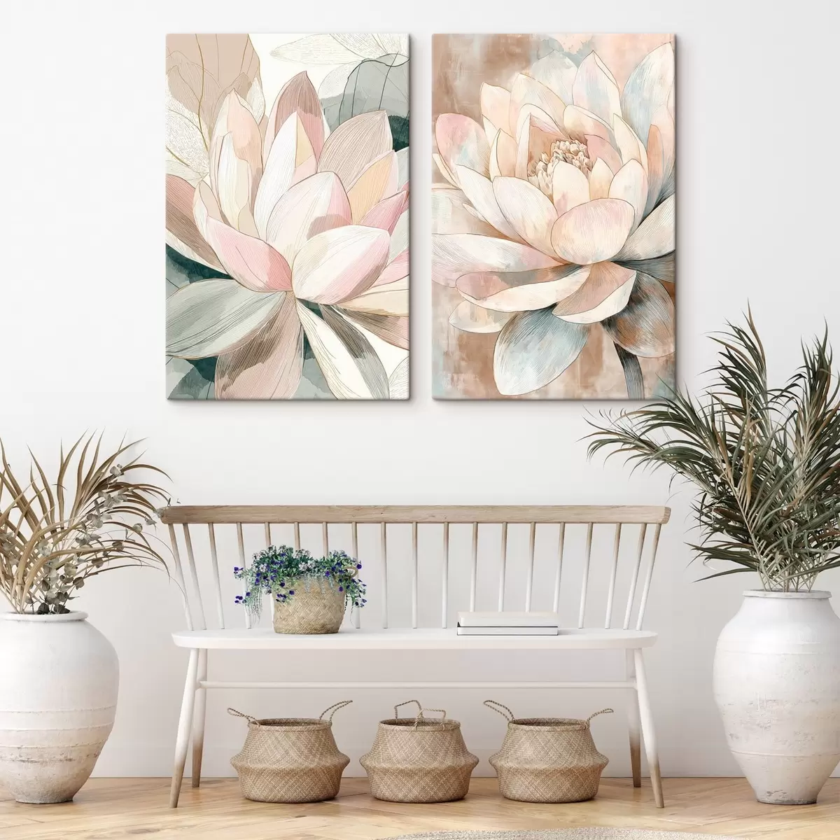 Vászonkép Virágkompozíció nagy lótuszokkal, pasztell-korall színpalettával Nr m30034