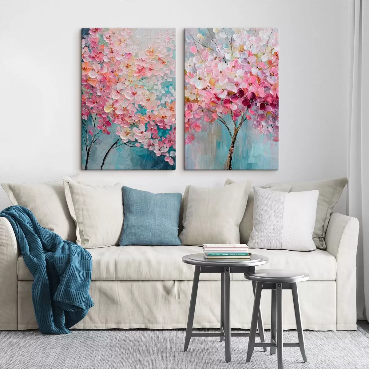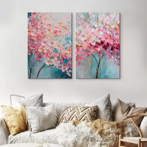Vászonkép Rózsaszín virágokkal borított, olajfestmény stílusú virágzó fa Nr m30040