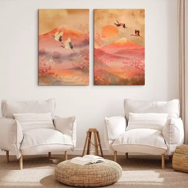 Vászonkép Japán táj darvakkal és a Fuji-heggyel, klasszikus illusztrációs stílusban Nr m30042