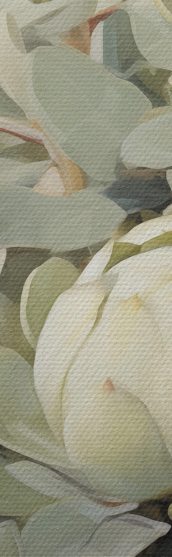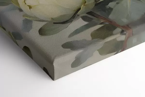 Vászonkép Több fehér protea virág és nagy zöld levelek festészeti stílusa világos háttér előtt Nr m30051