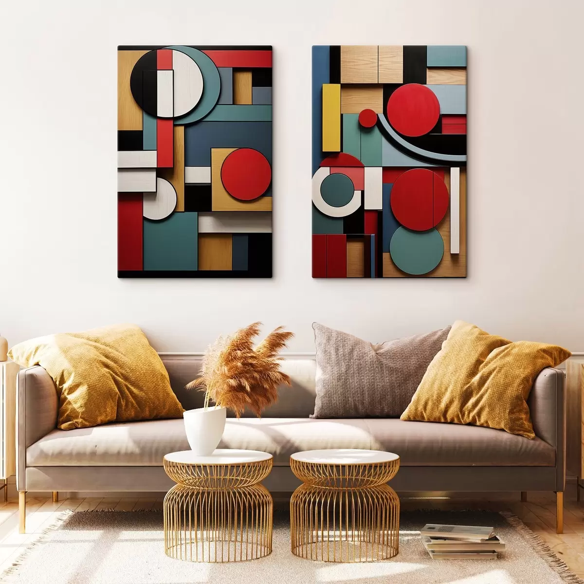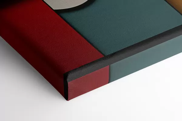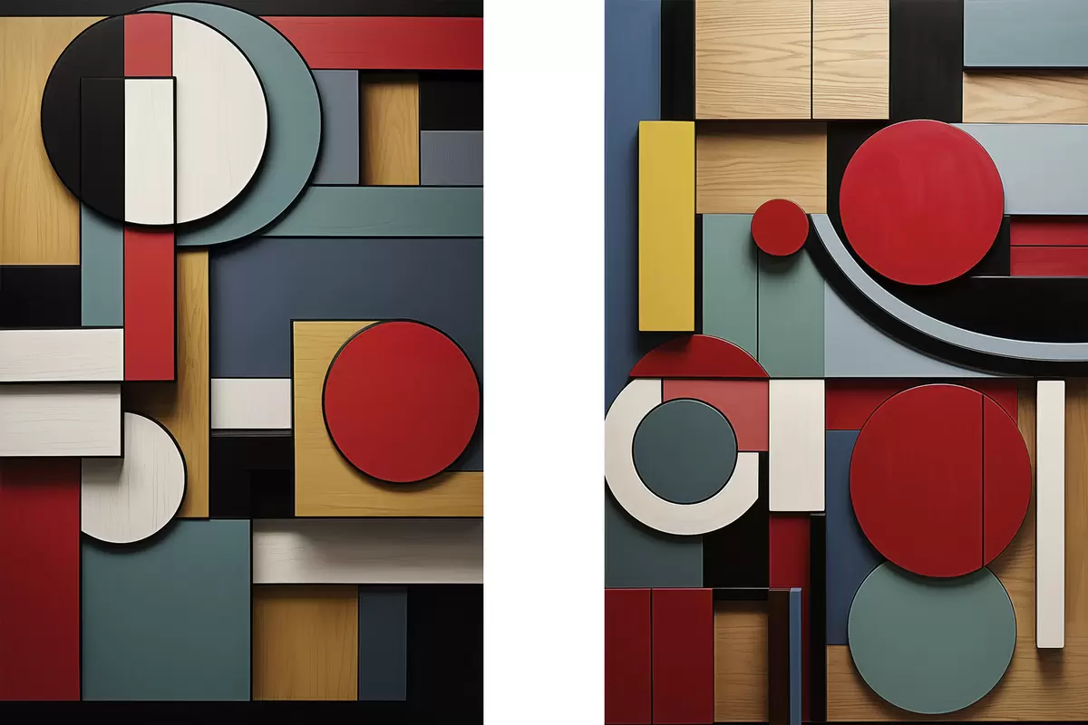 Vászonkép Absztrakt geometrikus kompozíció fa textúra utánzattal, piros, fekete, fehér és türkizkék téglalapokkal és körökkel Nr m30058