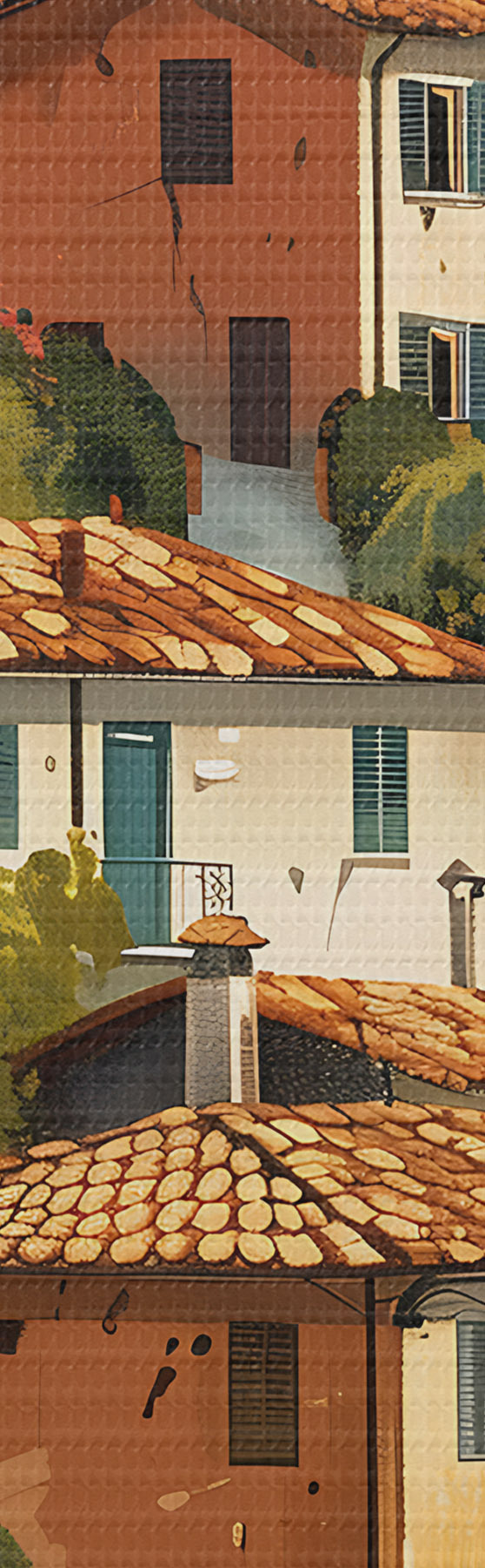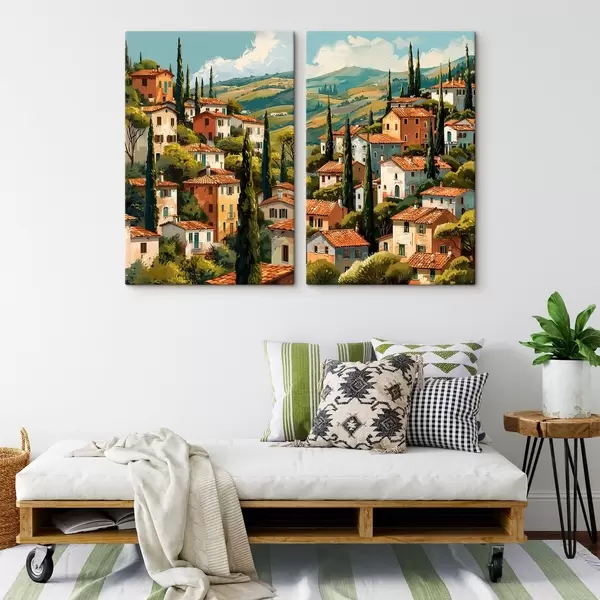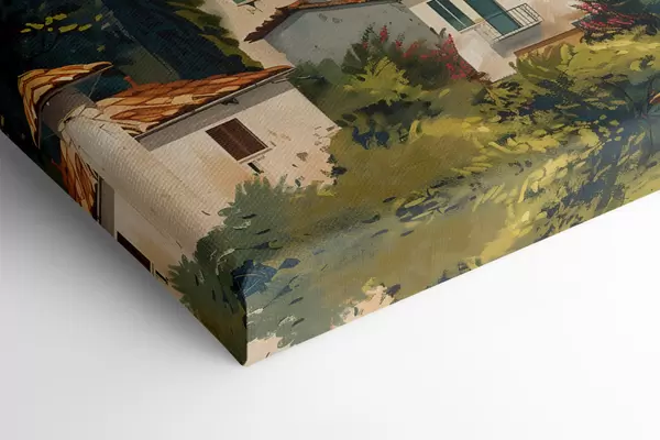 Vászonkép mediterrán domboldali falu, egymásra épült, meleg tónusú házak terrakotta tetővel Nr m30097