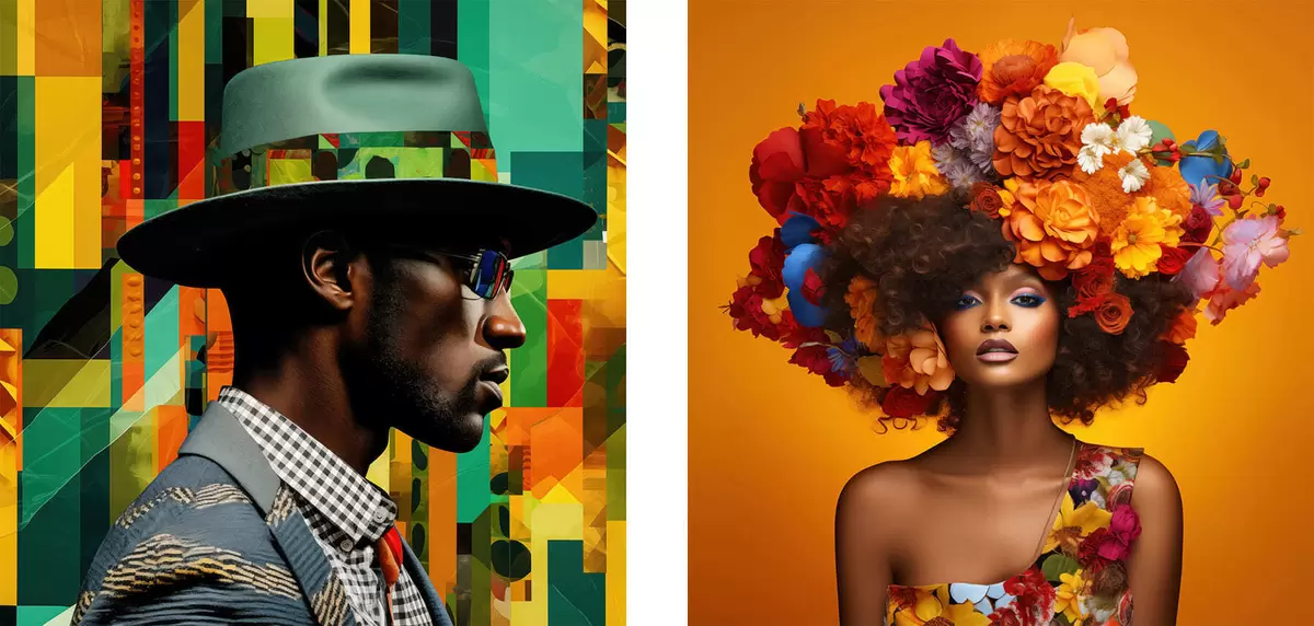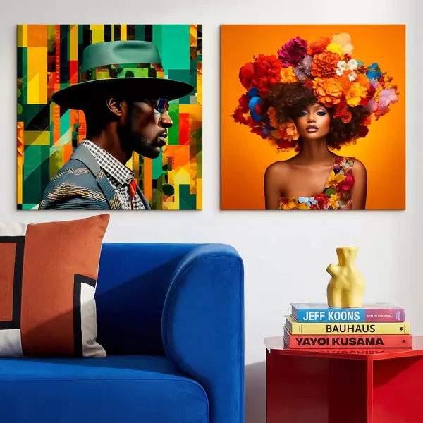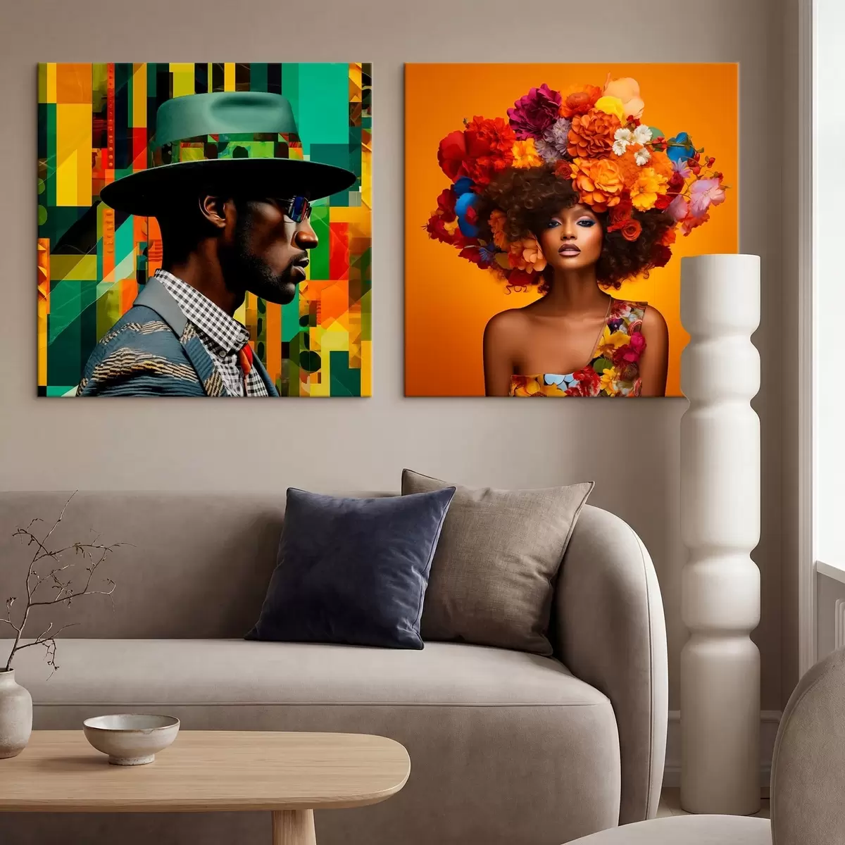 Vászonkép Portré egy kalapos férfiról és egy nagy virágkoszorút viselő nőről Nr m30102