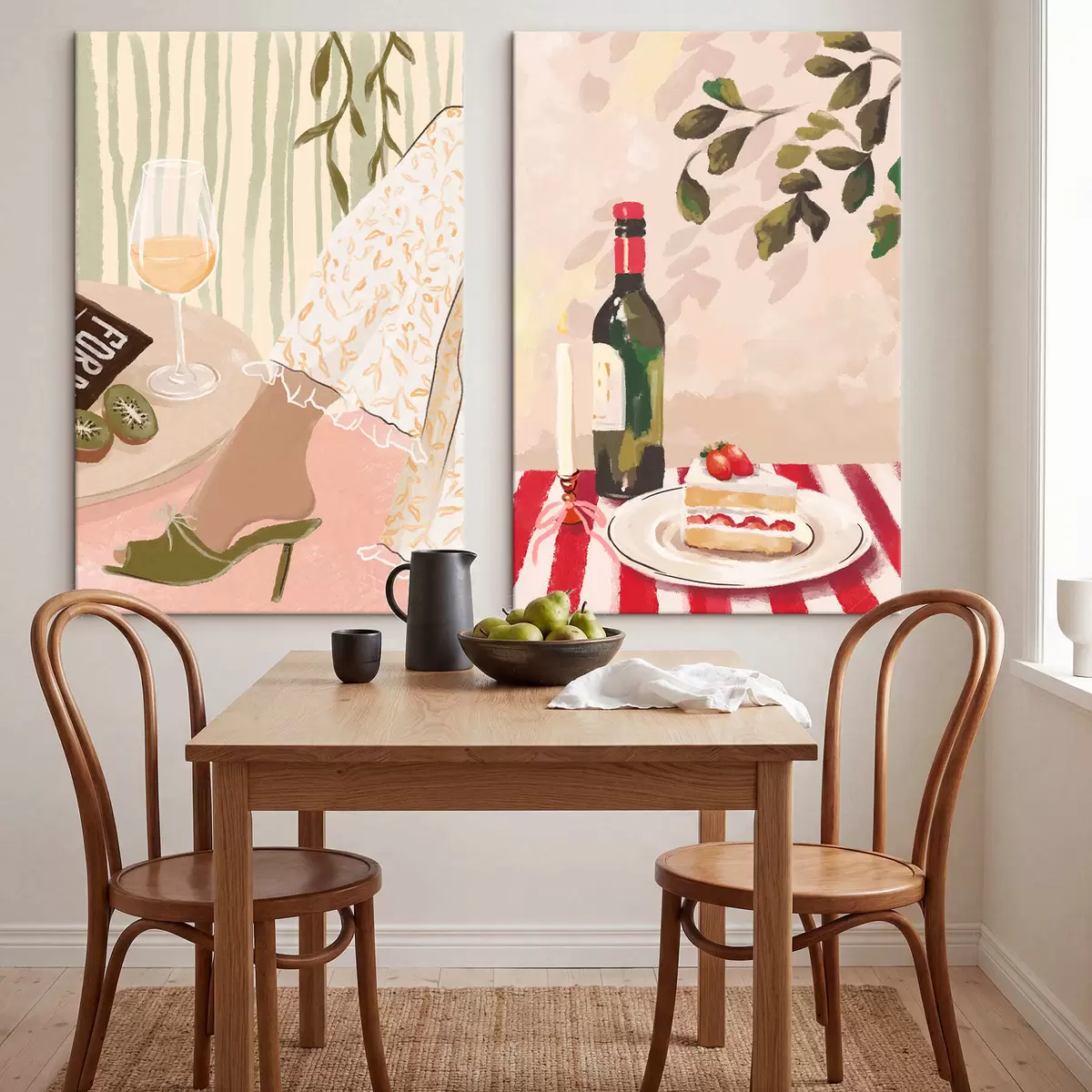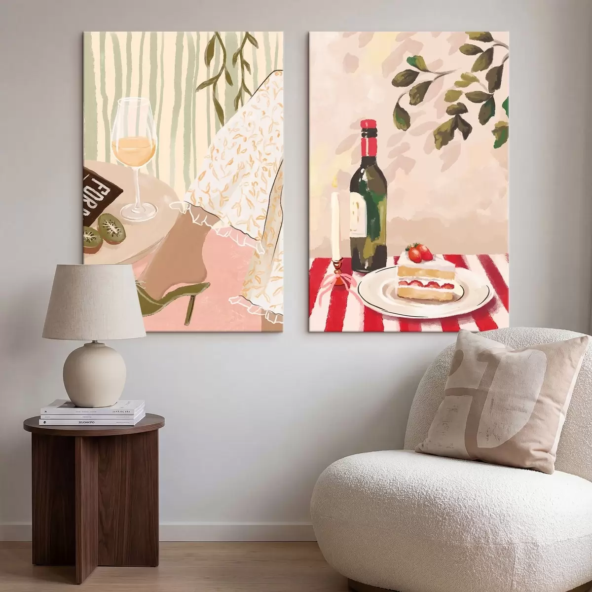 Vászonkép Borospohár, üveg és torta az asztalon Nr m30105