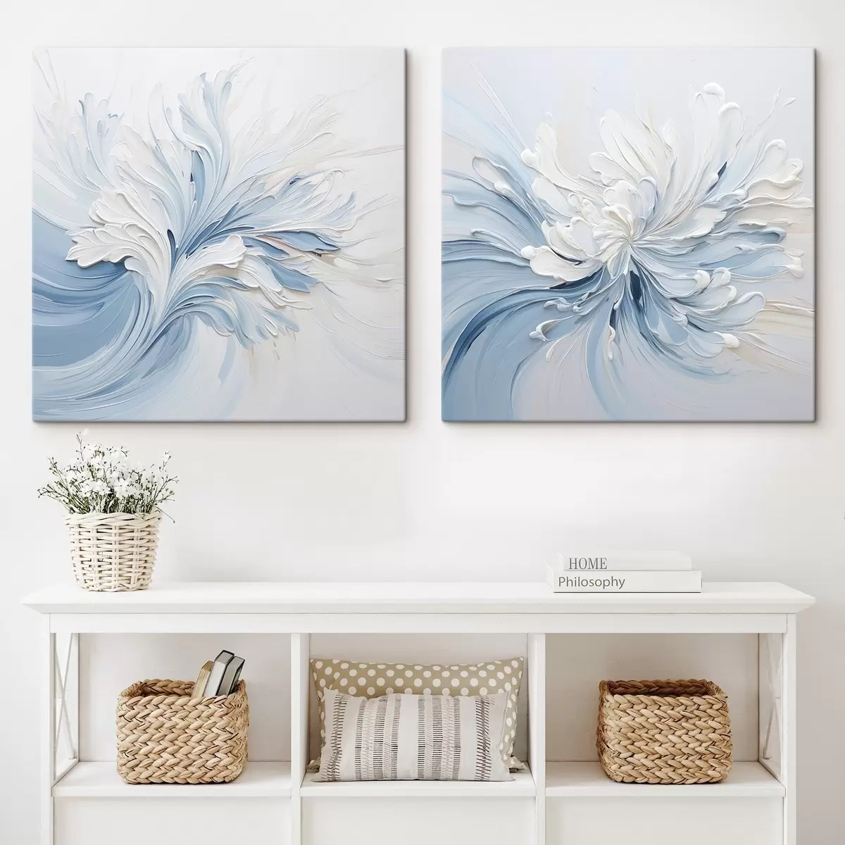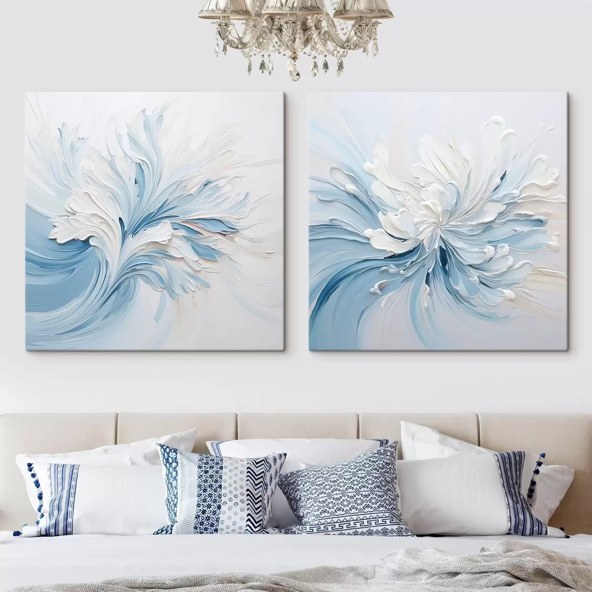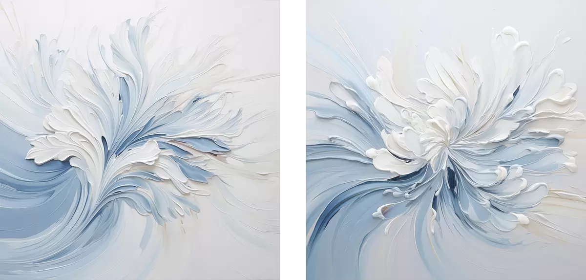 Vászonkép Fehér és világoskék absztrakt virágmotívum, texturált szirmokkal és kavargó vonalakkal Nr m30202
