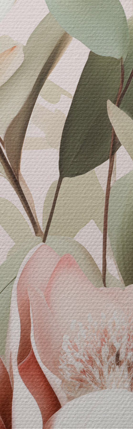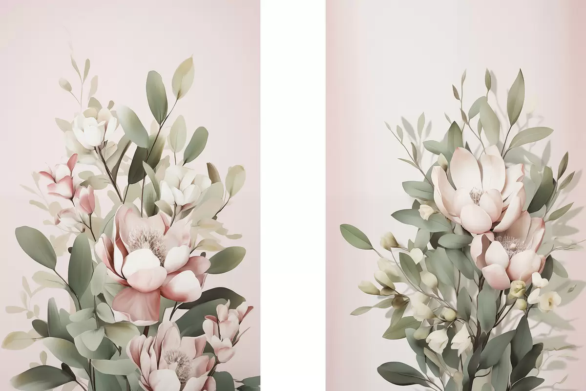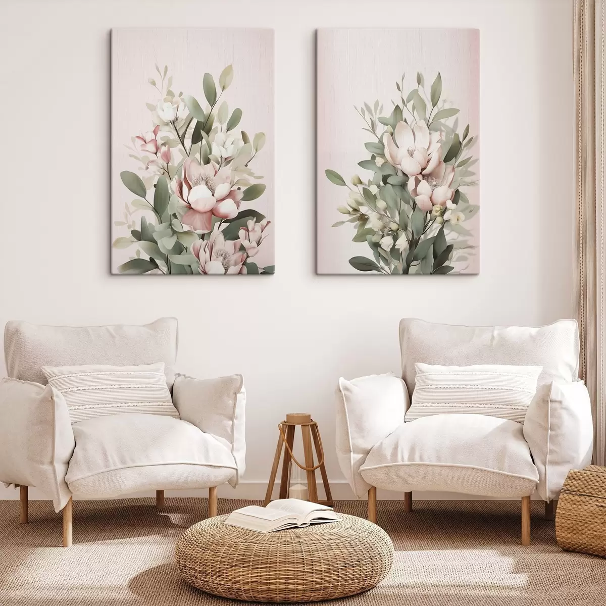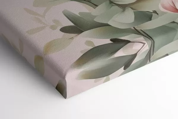 Vászonkép Pasztellszínű virágokból álló csokor eukaliptuszlevelekkel, halványrózsaszín háttérrel Nr m30314