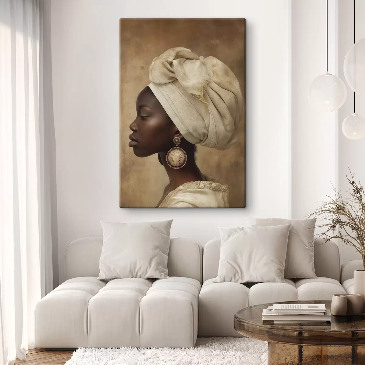 Vászonkép bézs színű nő portréja afrikai stílusban, nagy fülbevalóval Nr s26120