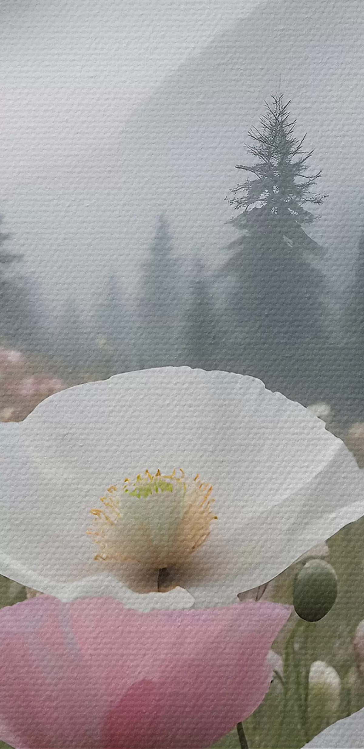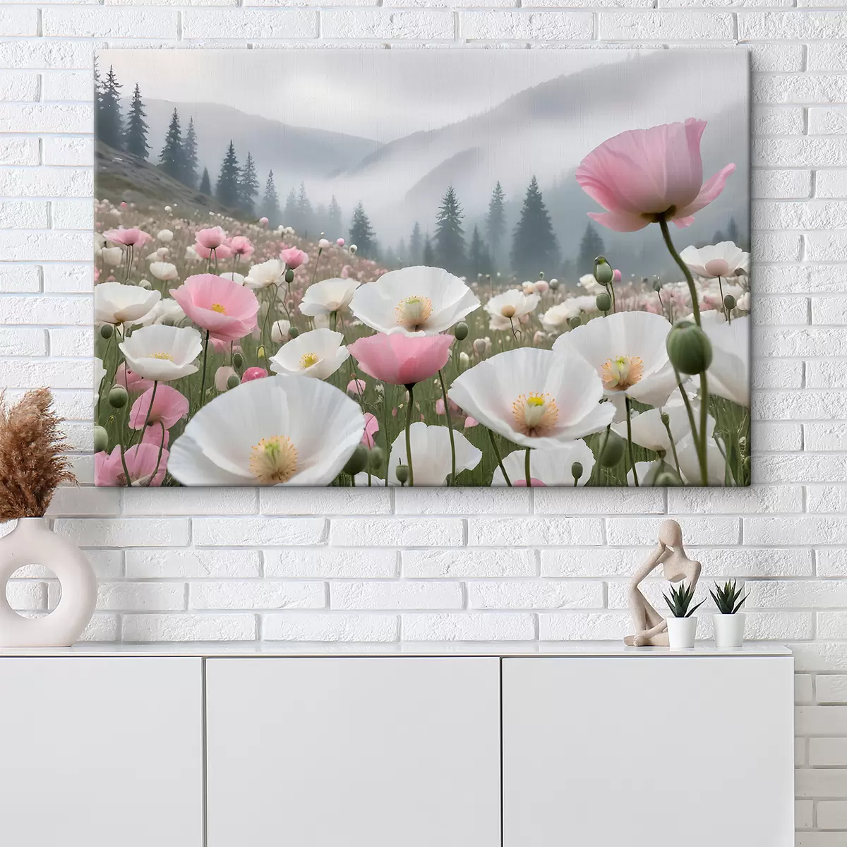 Vászonkép Rózsaszín és fehér pipacs mező a háttérben a hegyi tájon Nr s38369