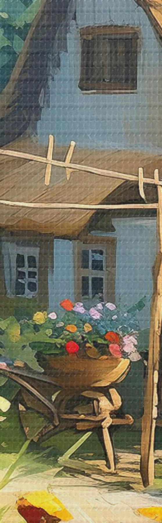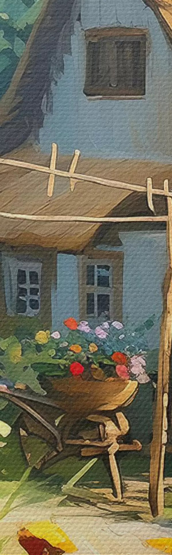 Vászonkép Falusi ház kerttel, nyári virágokkal, olajfestékkel, ecsetvonásokkal, mezővel, rusztikus stílusban Nr s38491