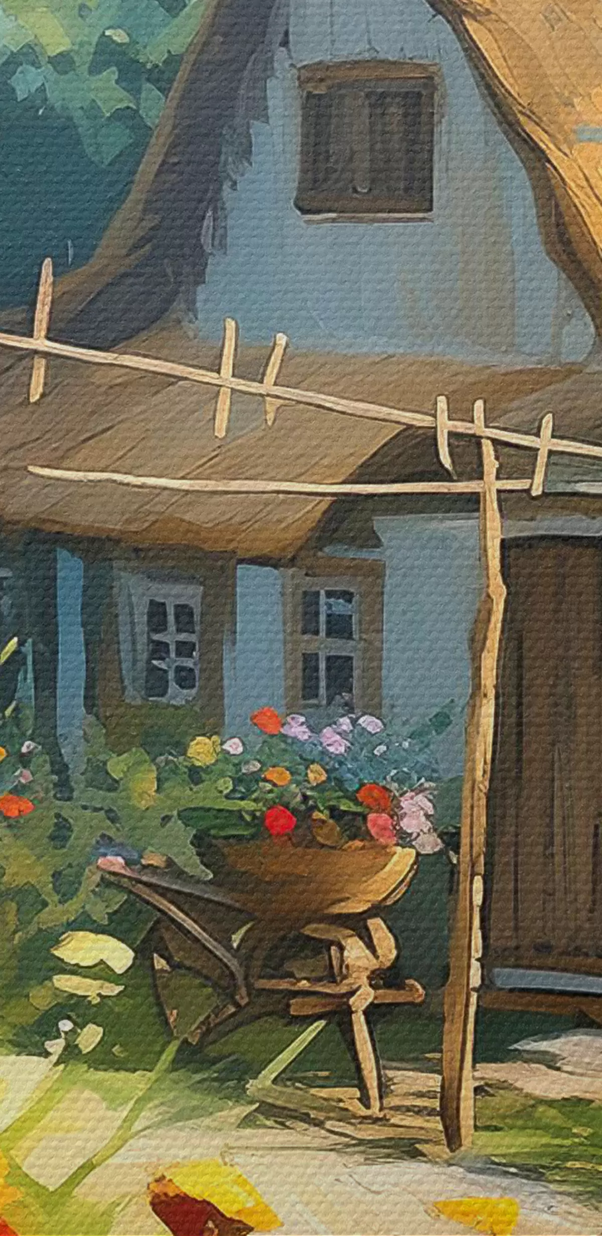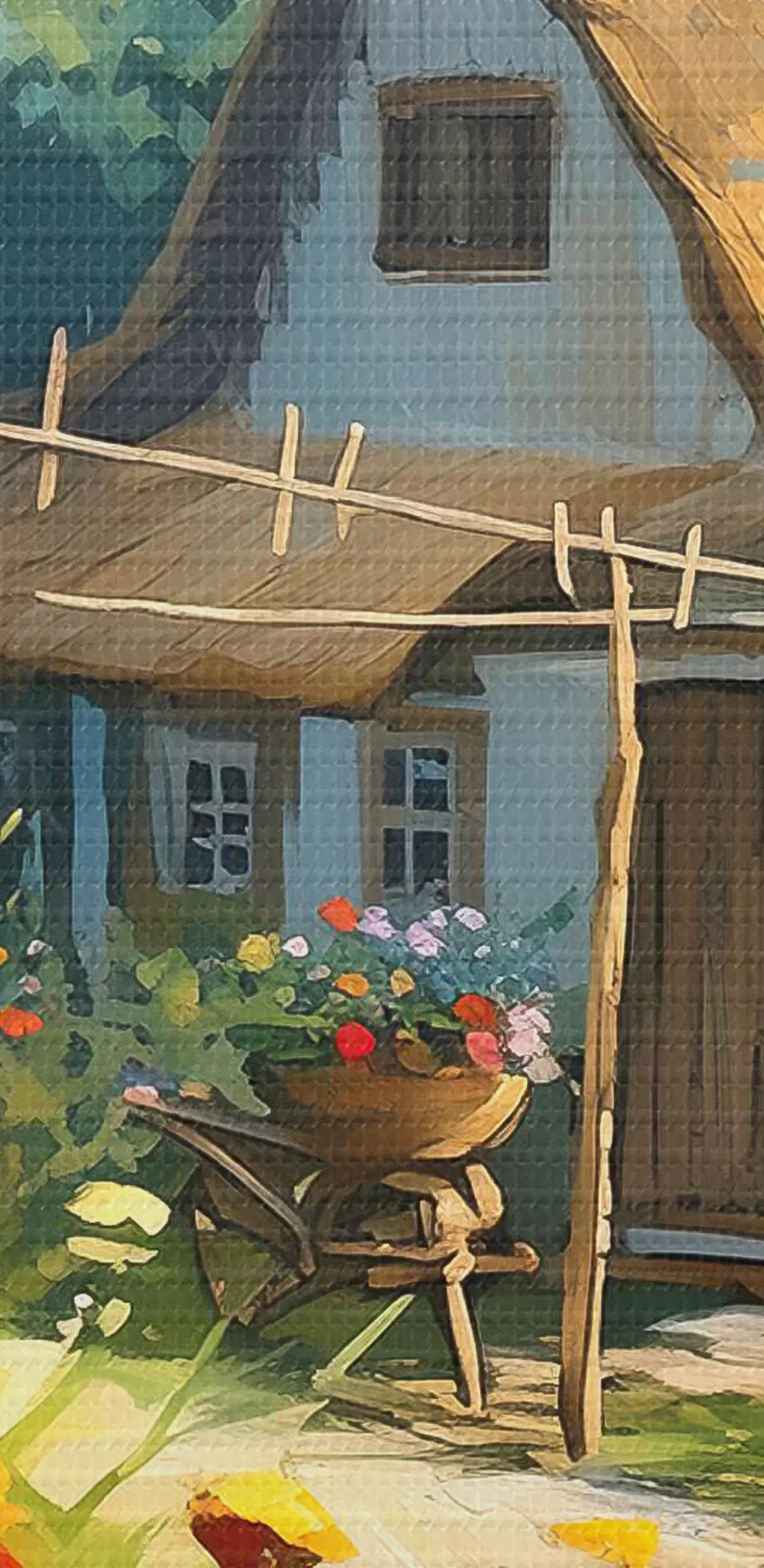 Vászonkép Falusi ház kerttel, nyári virágokkal, olajfestékkel, ecsetvonásokkal, mezővel, rusztikus stílusban Nr s38491