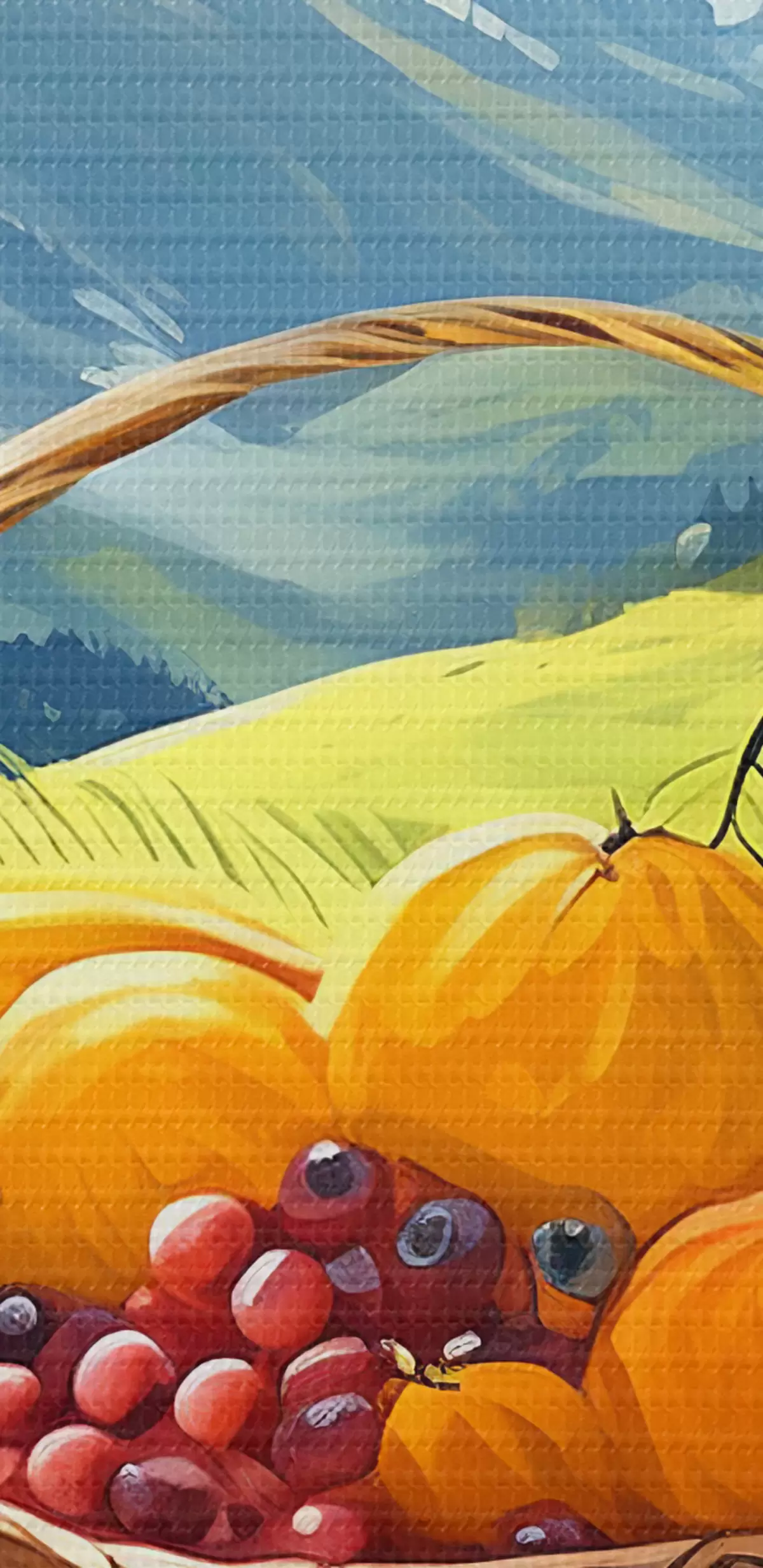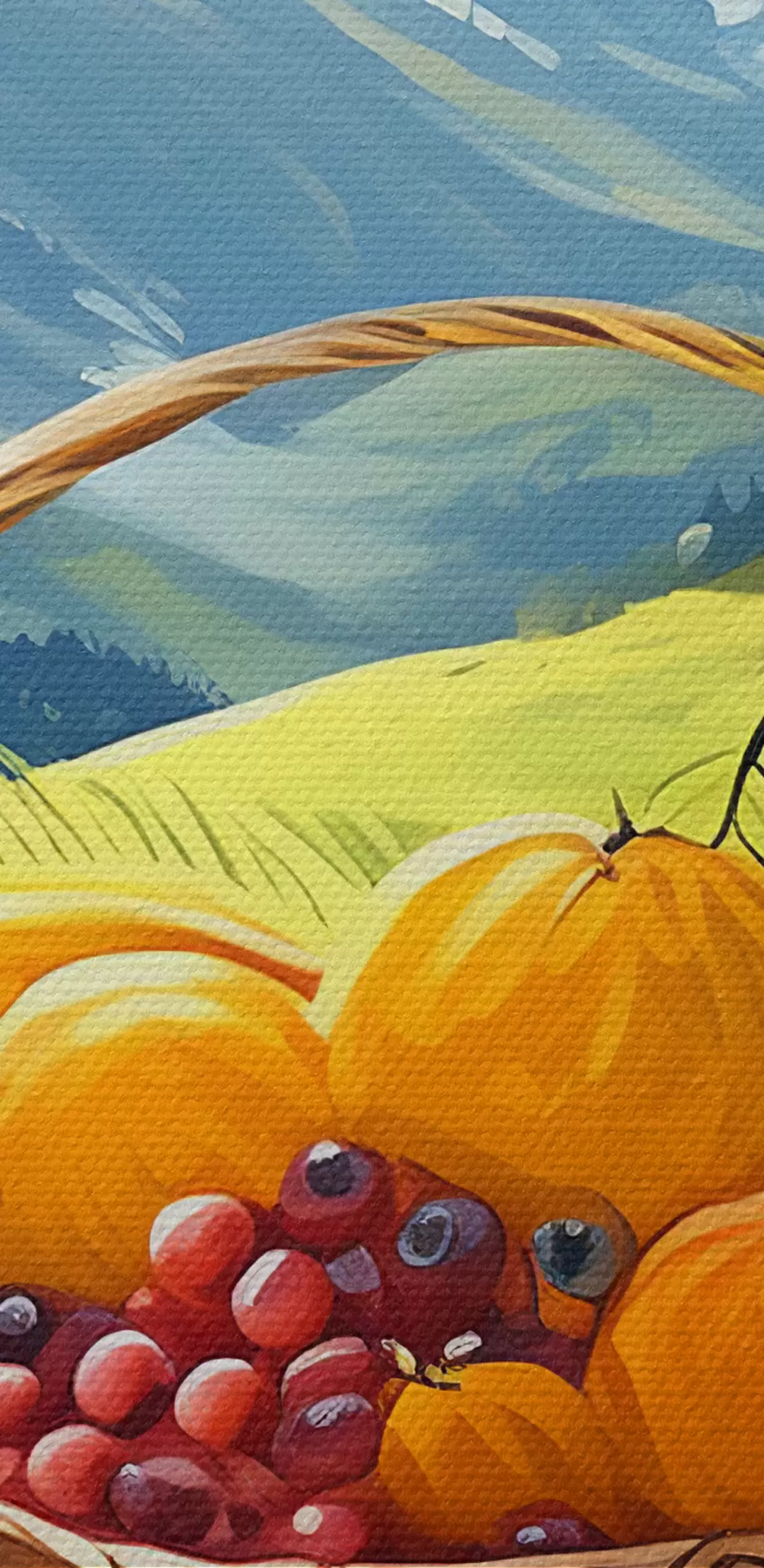 Vászonkép egy kosár gyümölcs egy réten a hegyekben Nr s38654