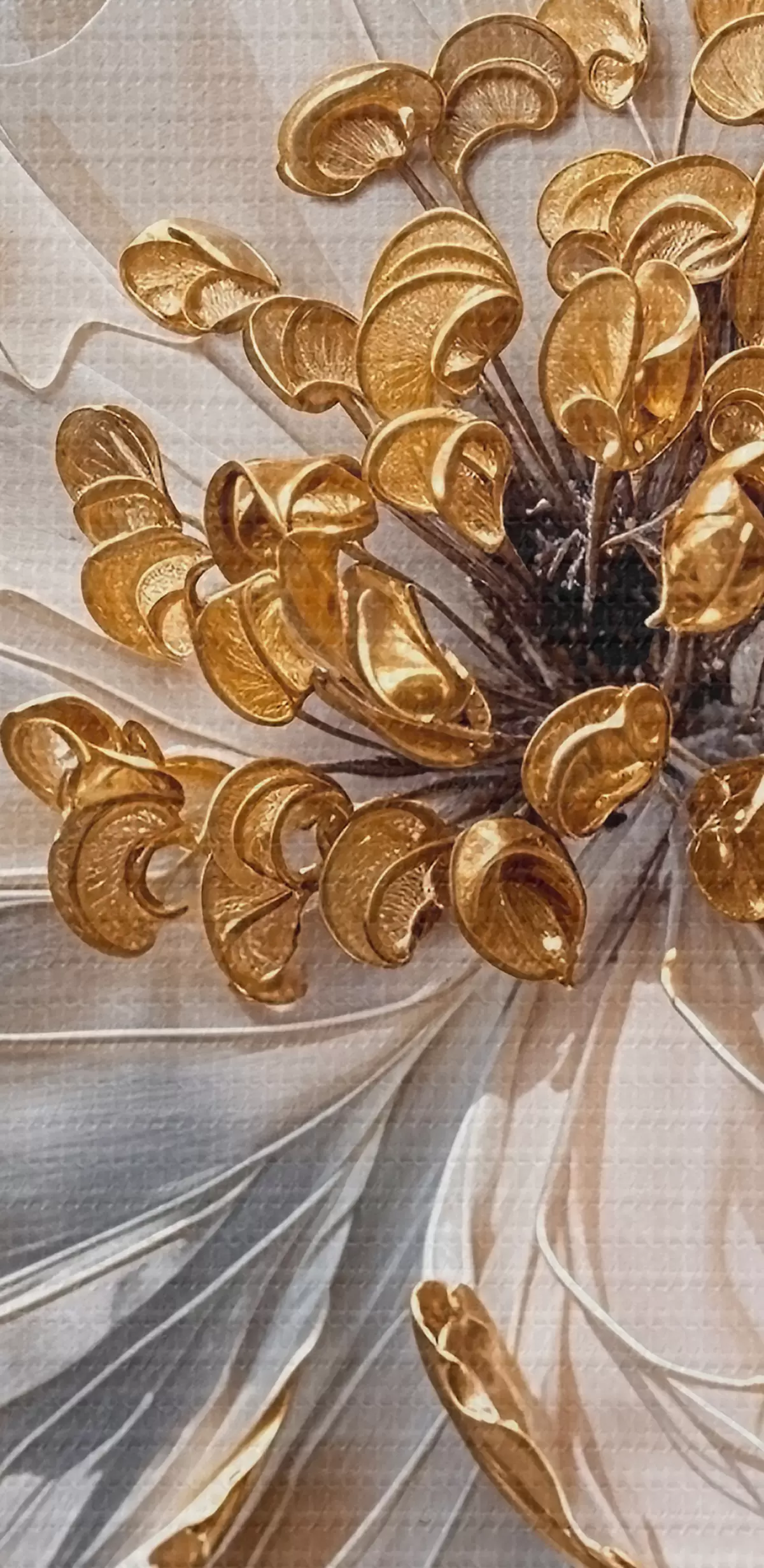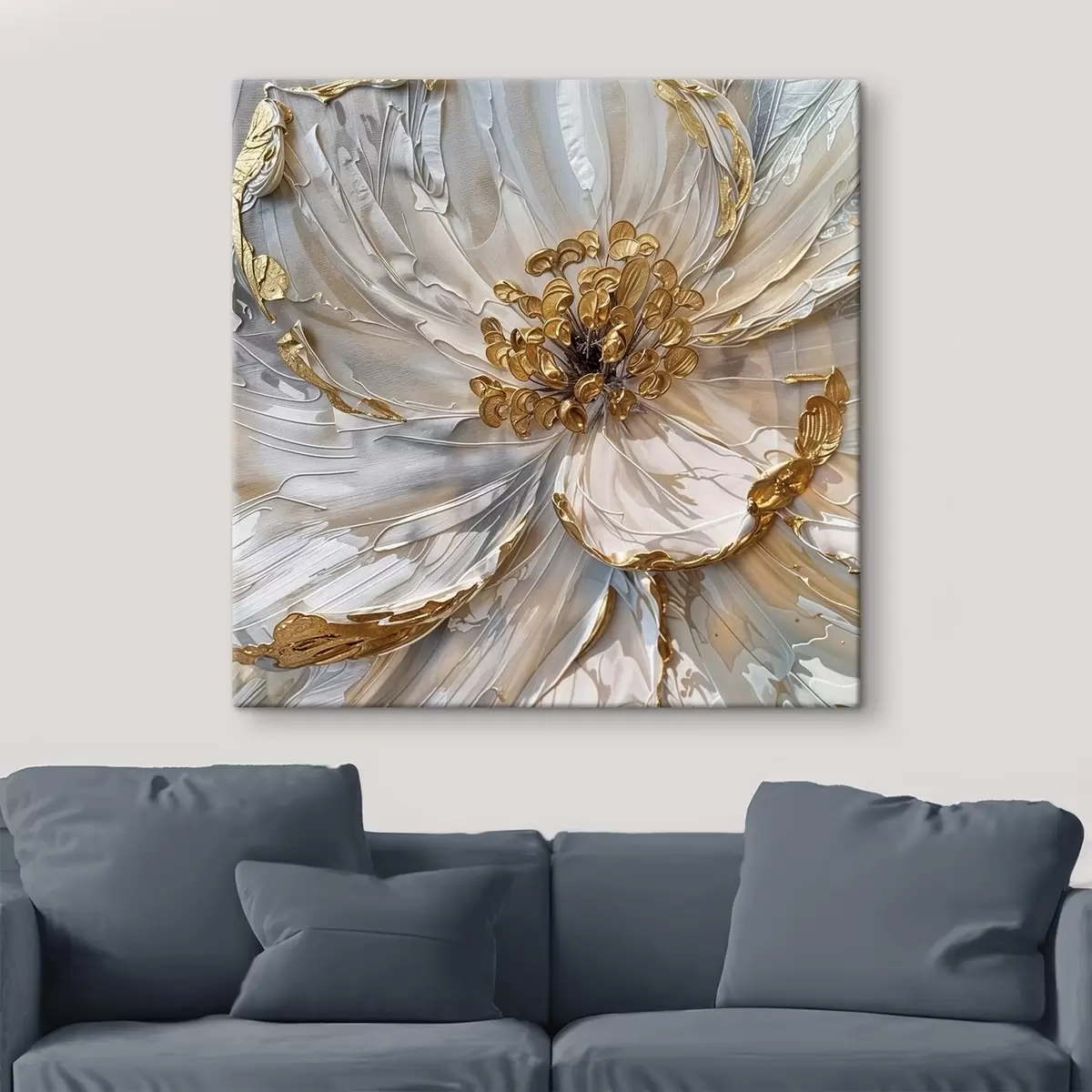 Vászonkép Közelkép egy nagy fehér virágról, sárga porzóval a közepén, olajjal festett művészi díszítéssel. Nr s38755