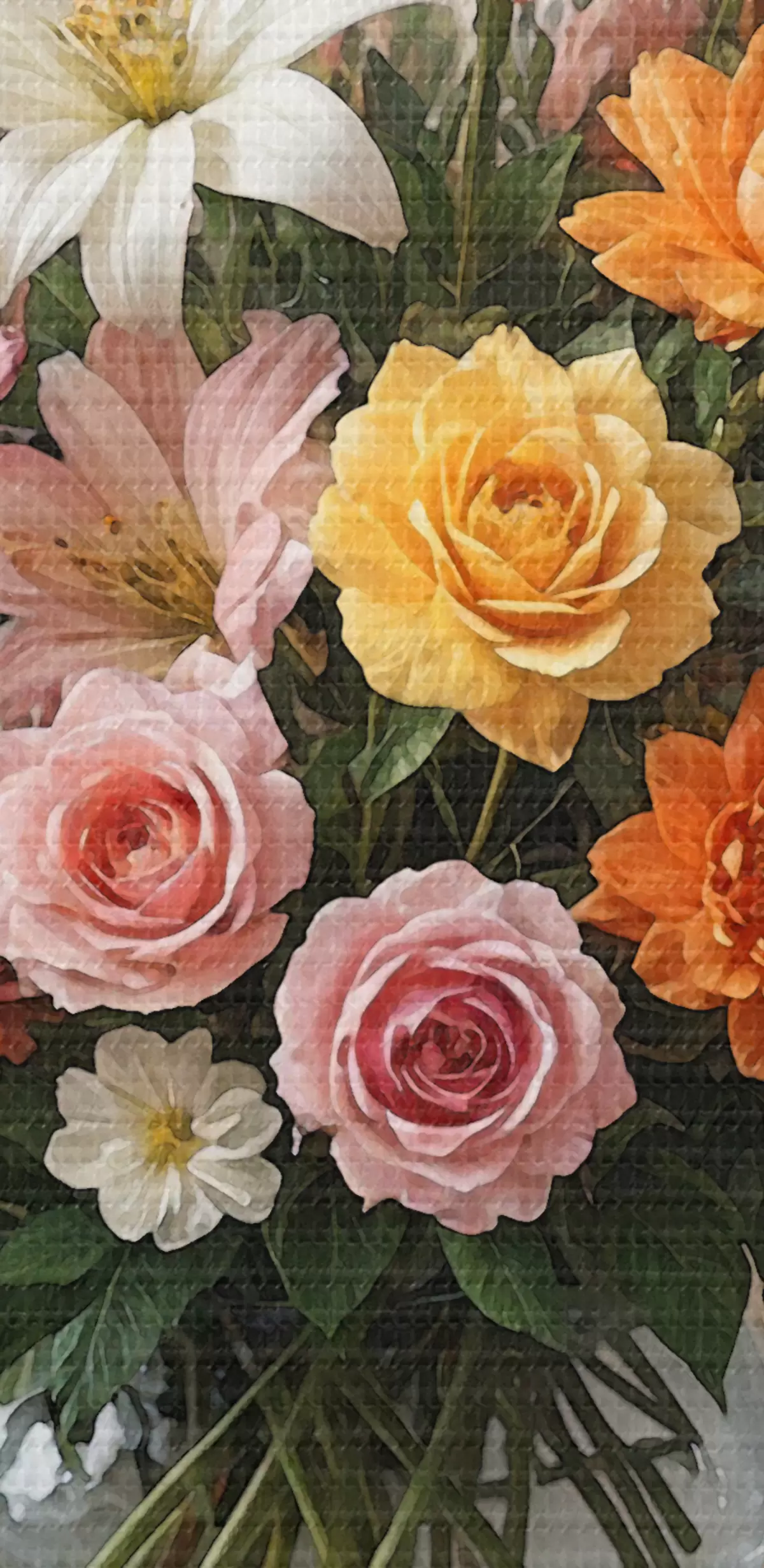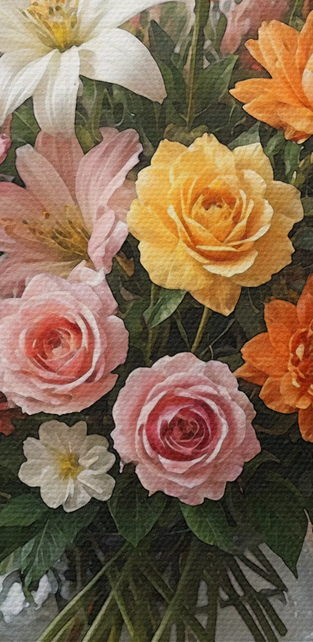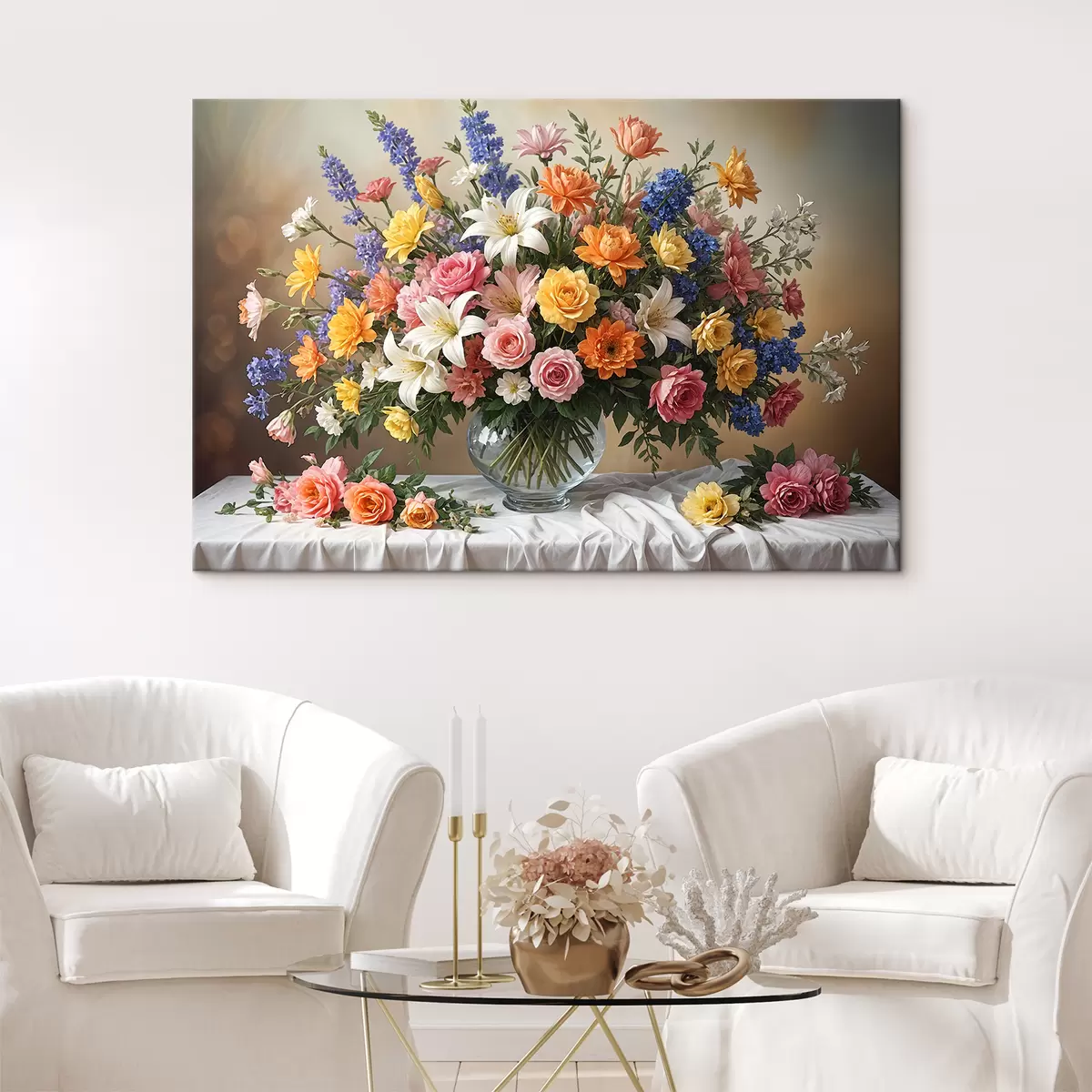 Vászonkép Különböző színes virágok élénk csokor üvegvázában, fehér terítőn, festmény vintage Nr s38825