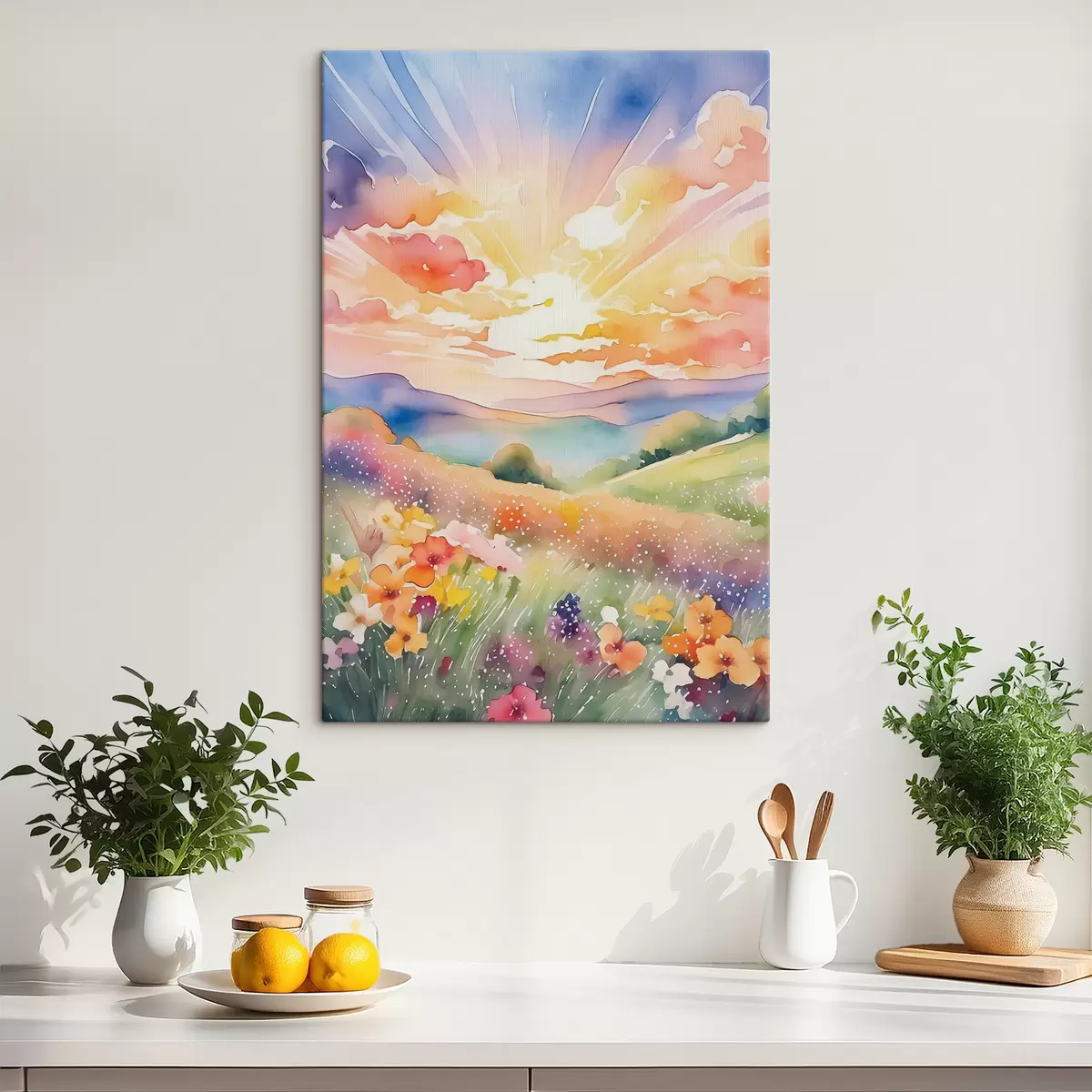 Vászonkép Naplemente a nyári mezőben, virágok, nap, színes égbolt, felhők, természet Nr s38842