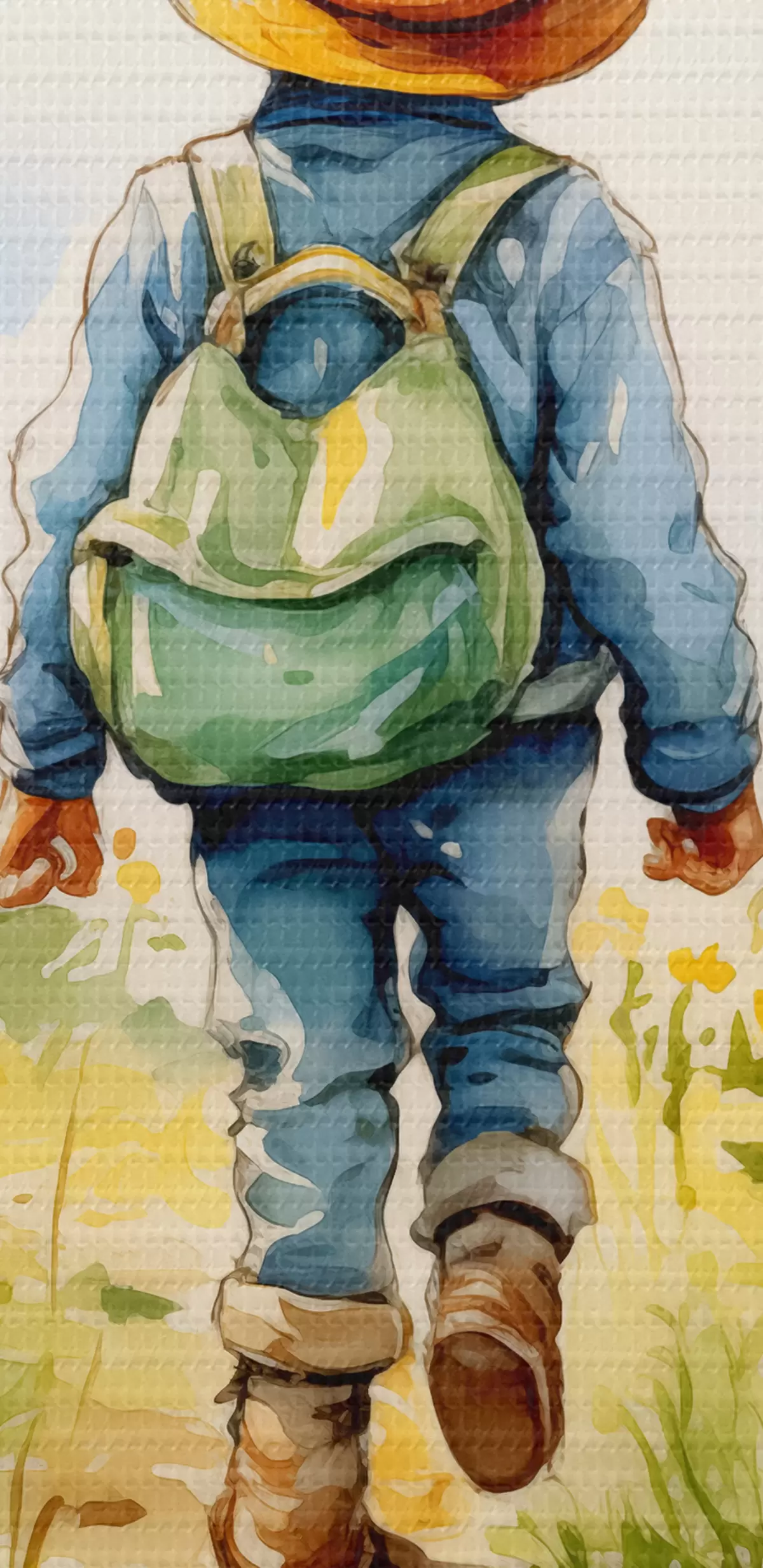 Vászonkép Egy cowboykalapos fiú, zöld hátizsákkal a háta mögött, kék öltönyben sétál egy ösvényen a kamillamezőben, akvarell Nr s38946