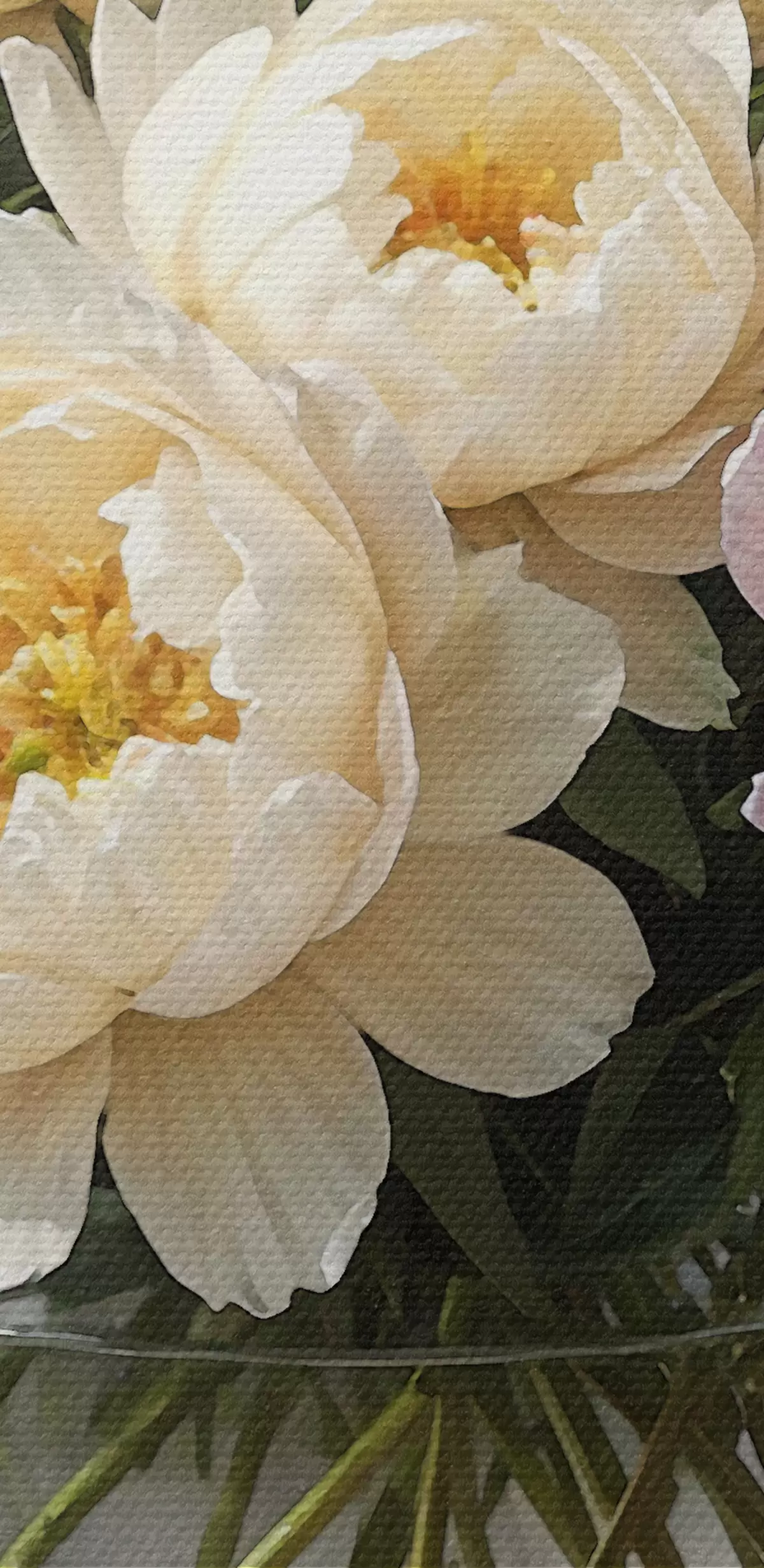 Vászonkép Gyönyörű fehér és rózsaszín pünkösdi rózsa csokor festménye egy fából készült asztal üvegvázában Nr s38967