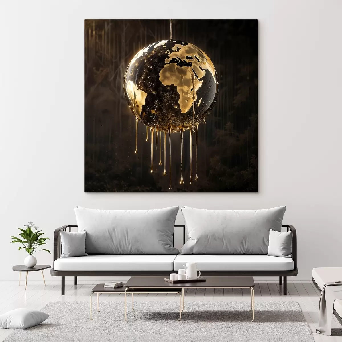 Vászonkép Egy izzó földgömb, amely a Földet ábrázolja, körülvéve csöpögő folyadékkal, sötét háttér előtt Nr s38983