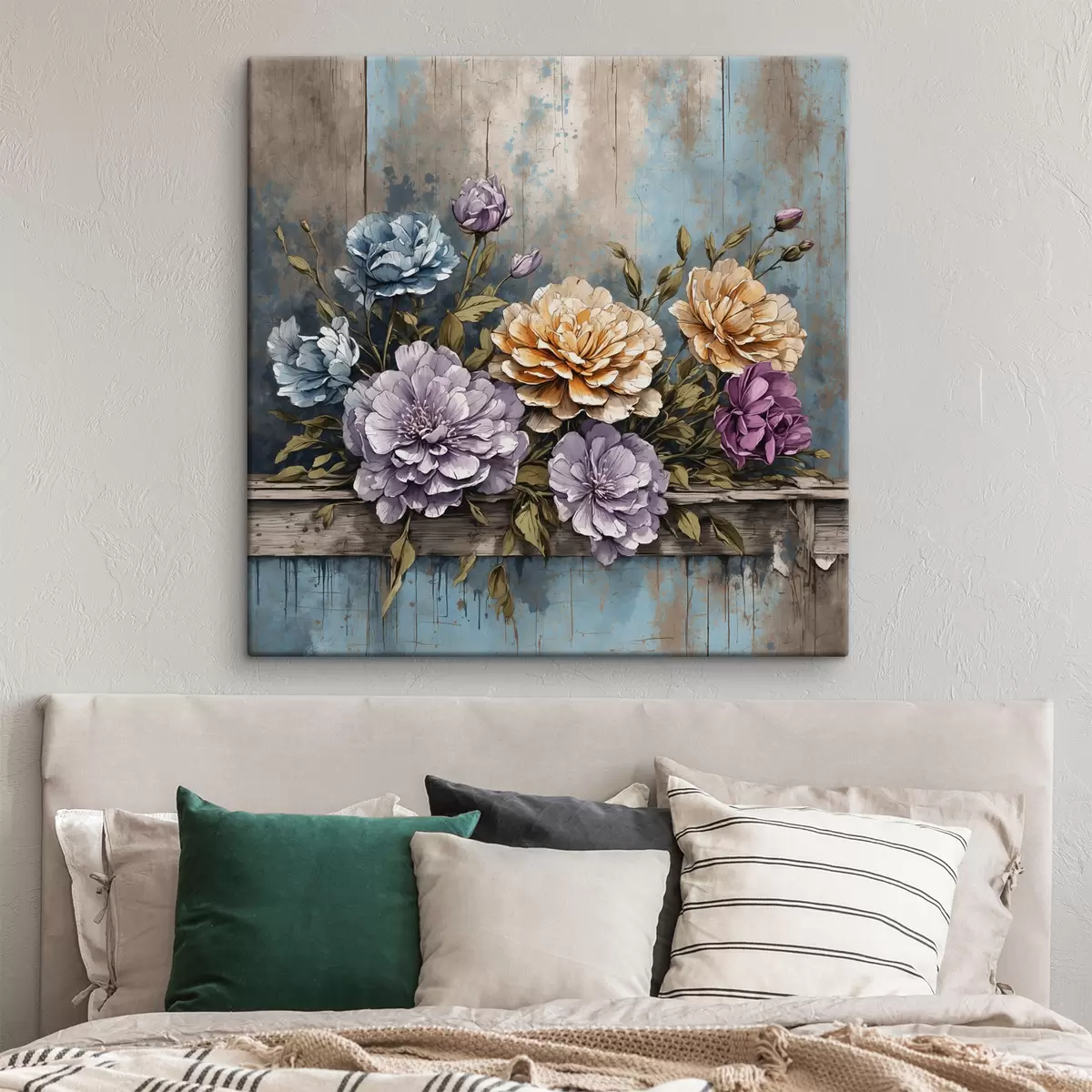 Vászonkép Virágok és levelek a régi fából készült polcon Nr s39169