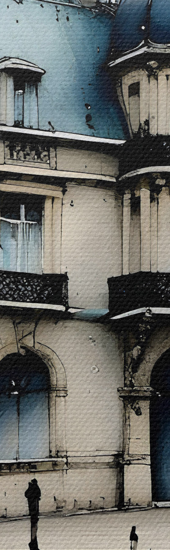Vászonkép Egy hatalmas épület akvarell művészet lámpaoszlopokkal és fákkal körülvéve, egy esős napon Nr s39391