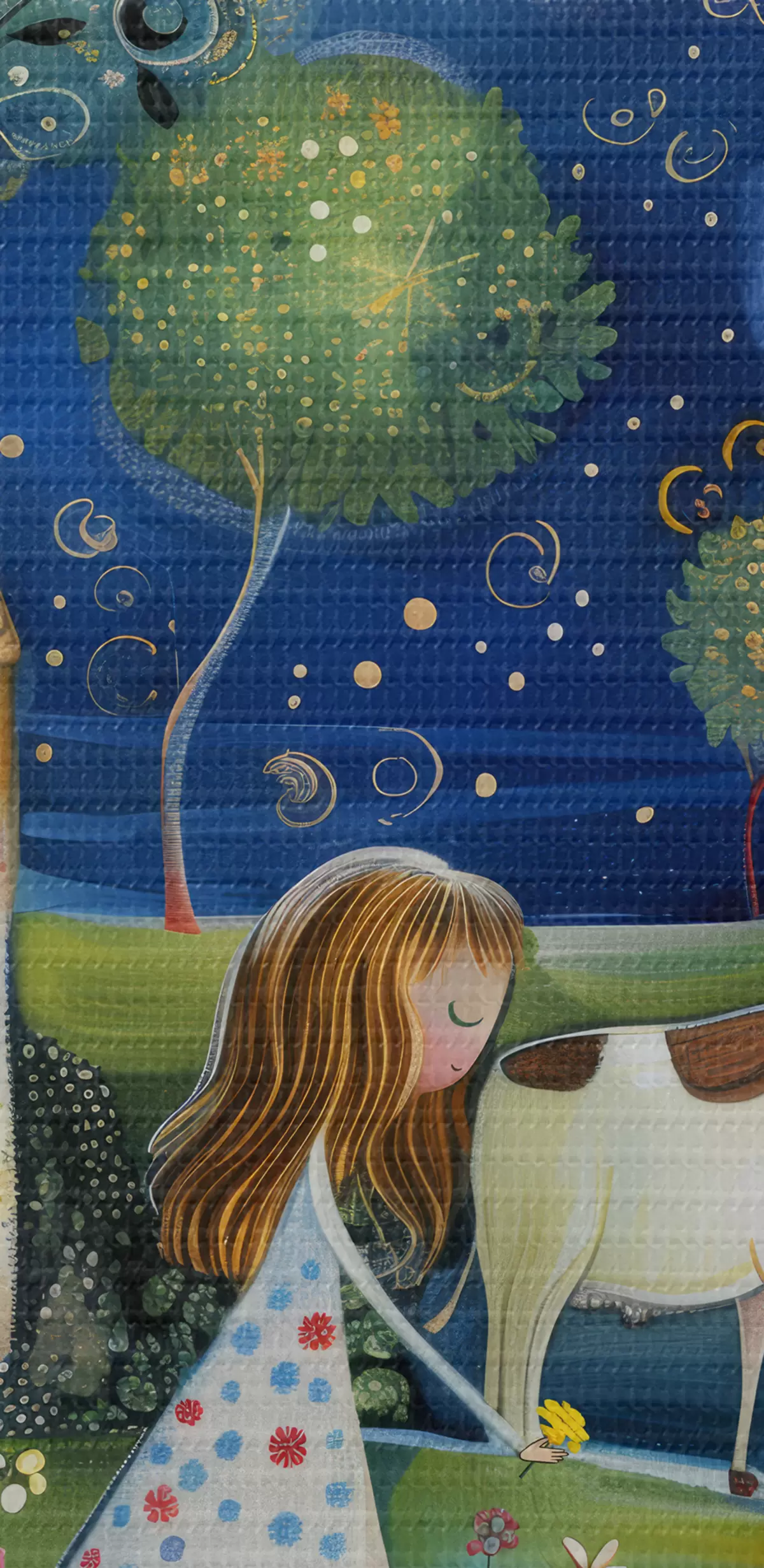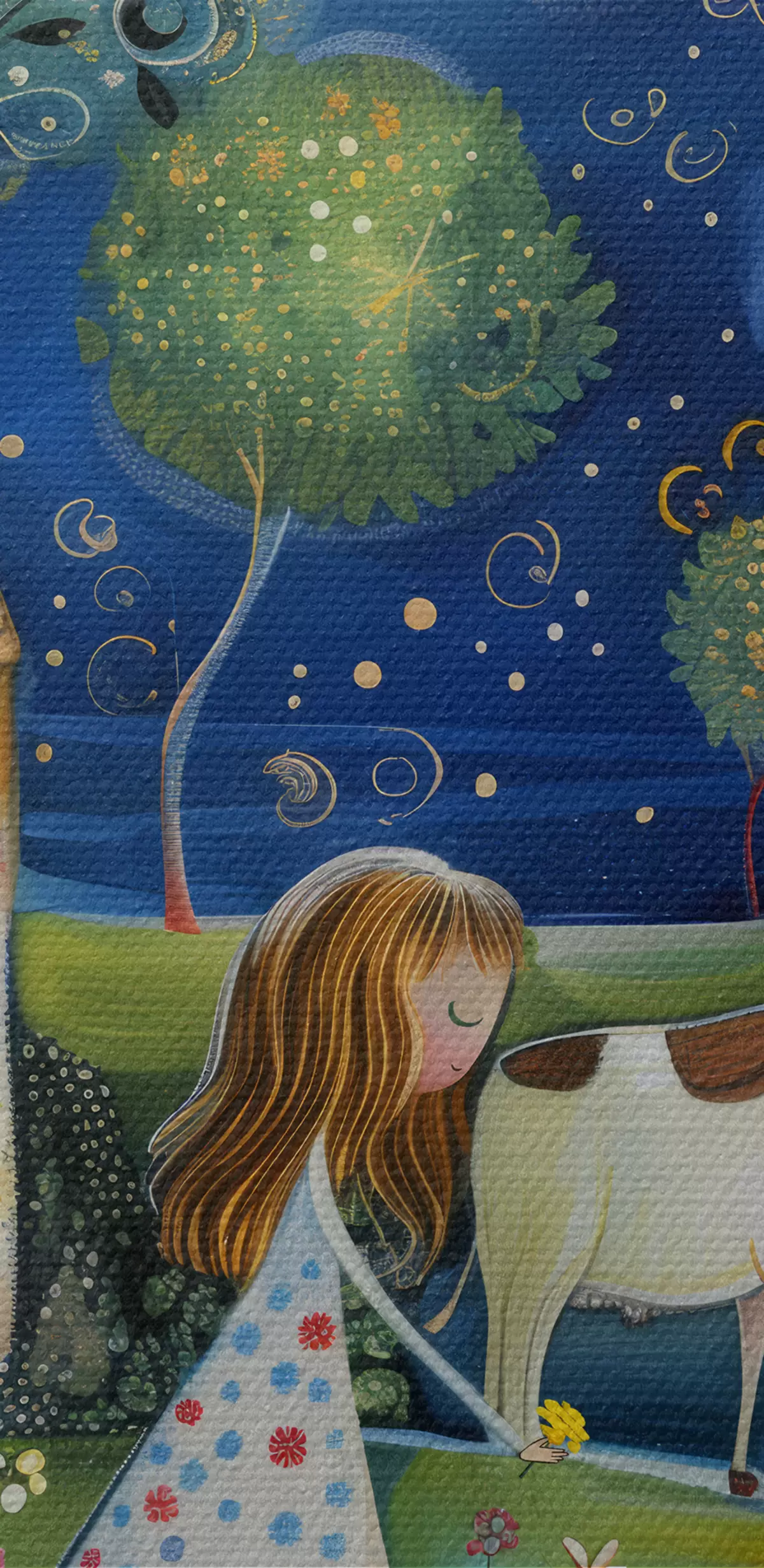 Vászonkép Egy kis hercegnő, kutya, tehén és fantáziaház a csillagok alatt szeszélyes naiv művészeti stílusban Nr s39451
