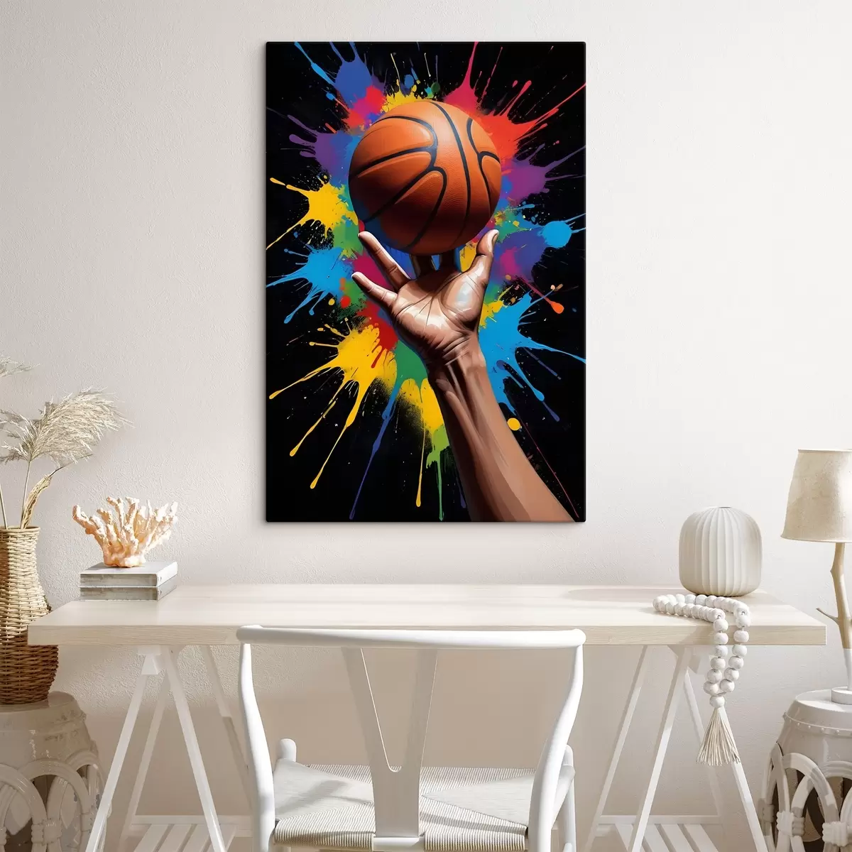 Vászonkép Egy kezében egy kosárlabda színes fröccs festék háttér előtt Nr s39529