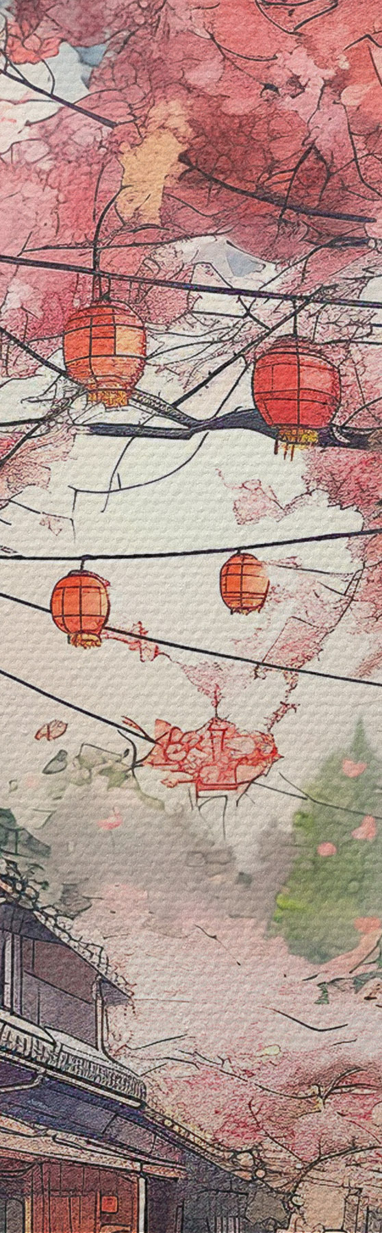 Vászonkép Japán utca virágzó cseresznyefákkal, keleti építészettel, lámpásokkal Nr s39774