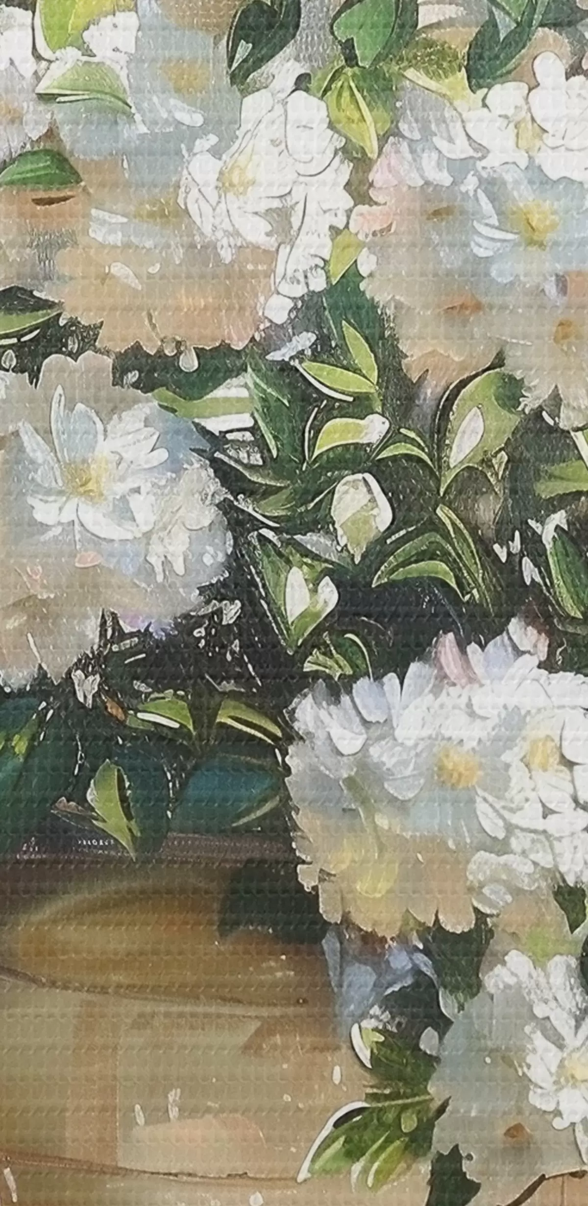 Vászonkép Fehér hortenziák a vázában, napfény az ablakban, olajfestmény Nr s39779