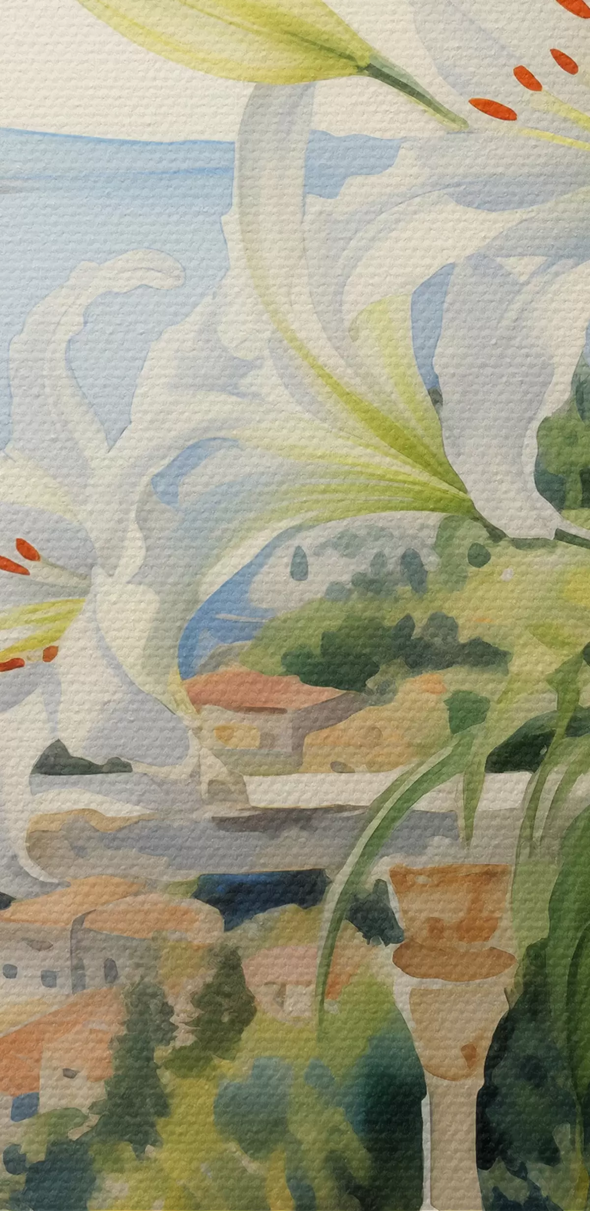 Vászonkép Fehér liliomok egy edényben az erkélyen, az öböl akvarell hátterében Nr s39932