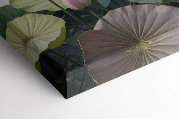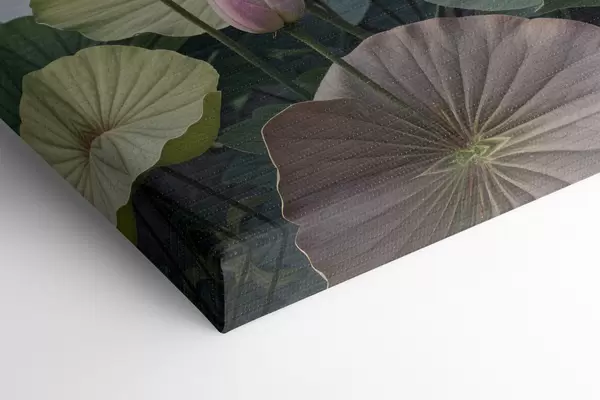 Vászonkép Egy buja tó, tele élénk rózsaszín és fehér lótuszvirágokkal, nagy zöld liliompárákkal körülvéve Nr s40145