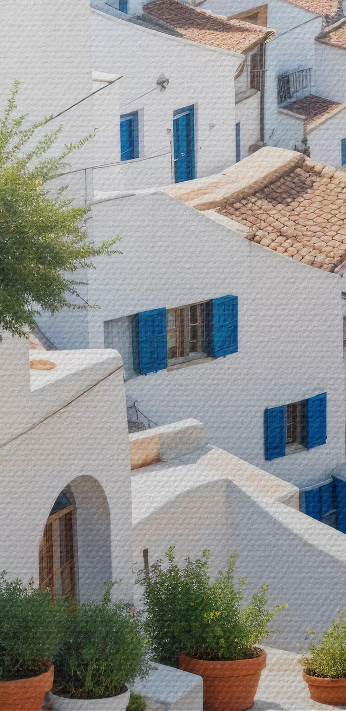 Vászonkép Festői tengerparti város fehér épületekkel, kék ablakokkal és cserepes növényekkel a szűk utcákon Nr s40148