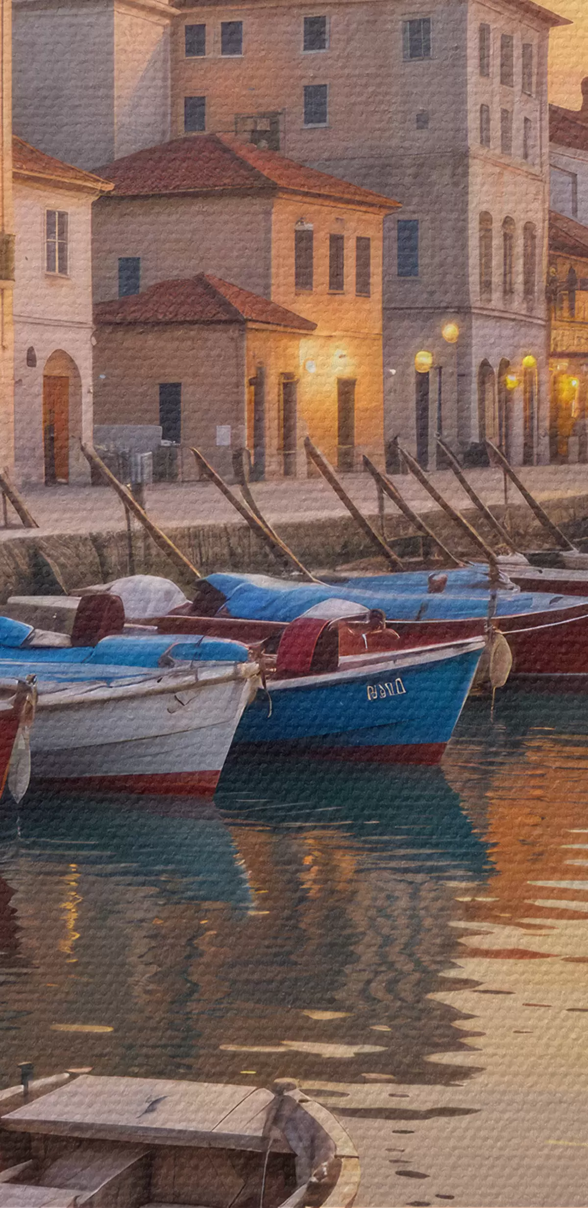 Vászonkép Olasz tengerparti város naplementekor, színes épületekkel a vízparton és csónakokkal, amelyek a nyugodt vizeken úsznak Nr s40150