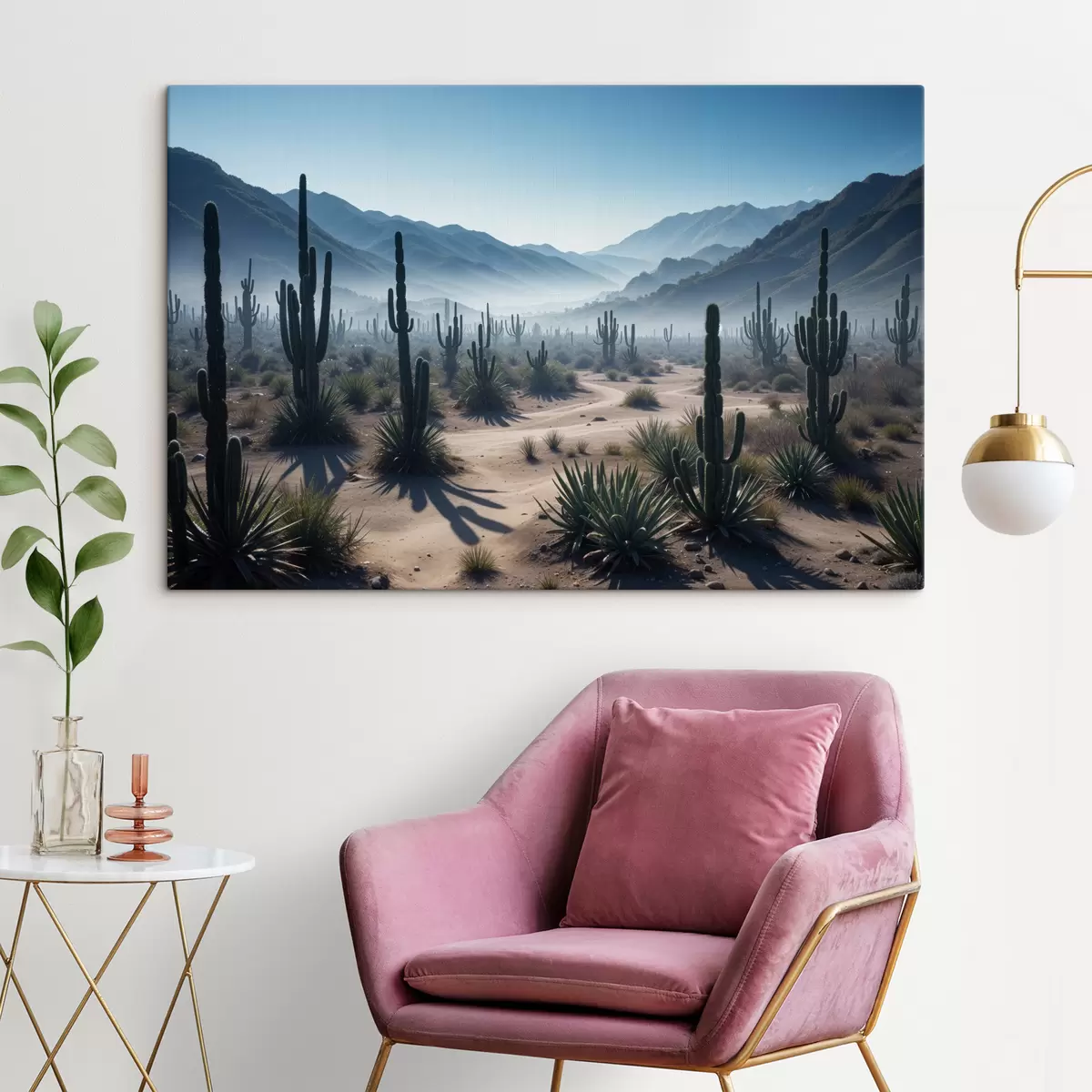 Vászonkép Sivatagi táj magas kaktuszok és yucca növények az előtérben, ködös hegyekkel körülvéve Nr s40153