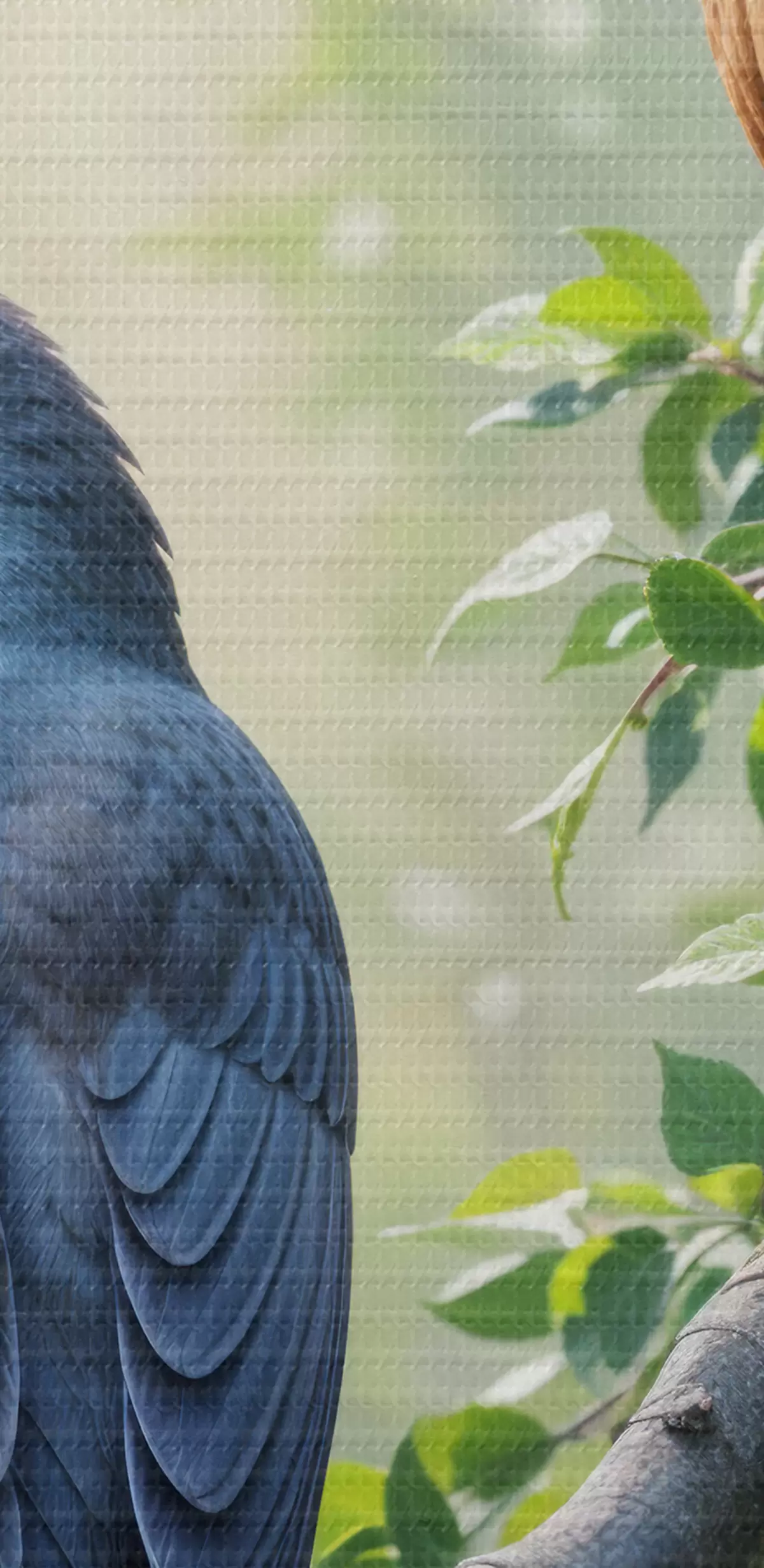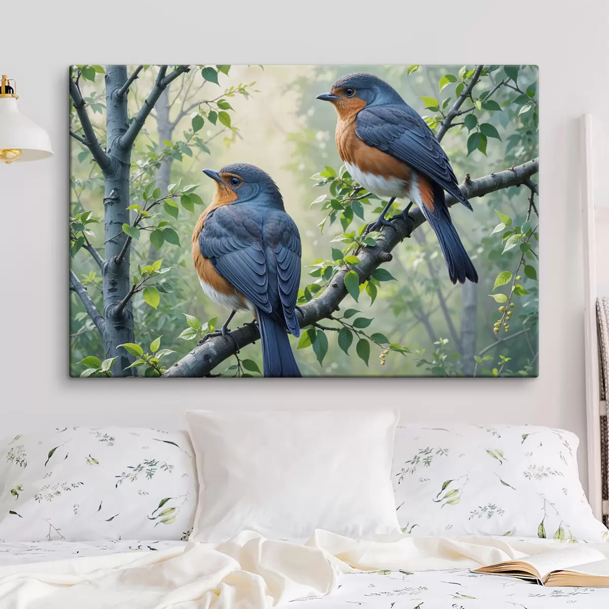 Vászonkép Két kék és narancssárga madár ült egy fa ágán, zöld levelekkel a háttérben Nr s40156