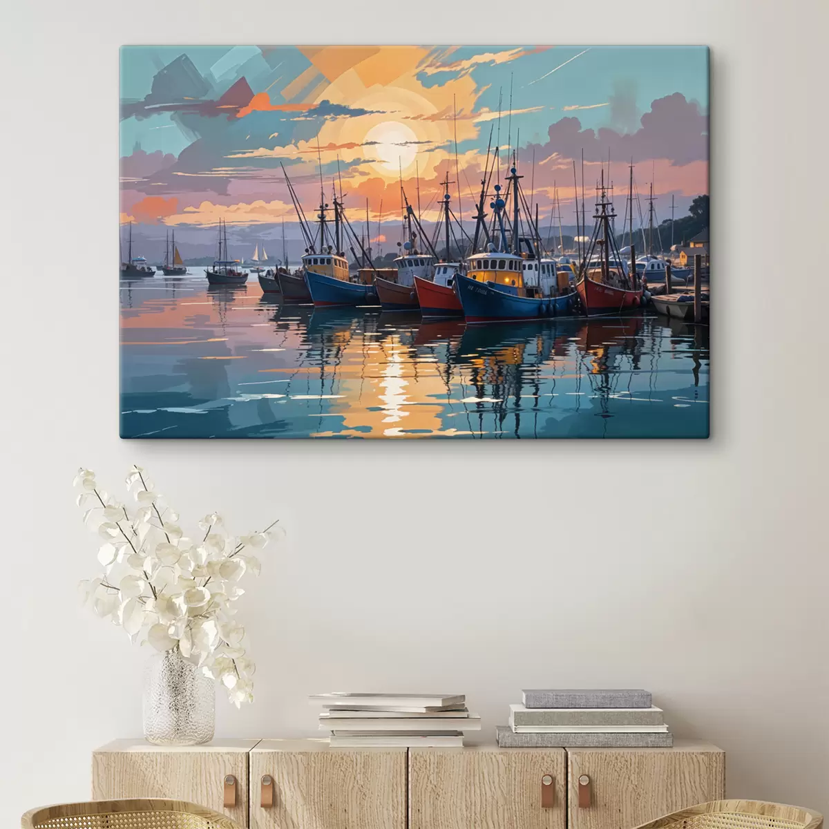 Vászonkép Színes naplemente halászhajókkal és hajókkal teli kikötő felett, amely nyugodt és festői látványt nyújt Nr s40158