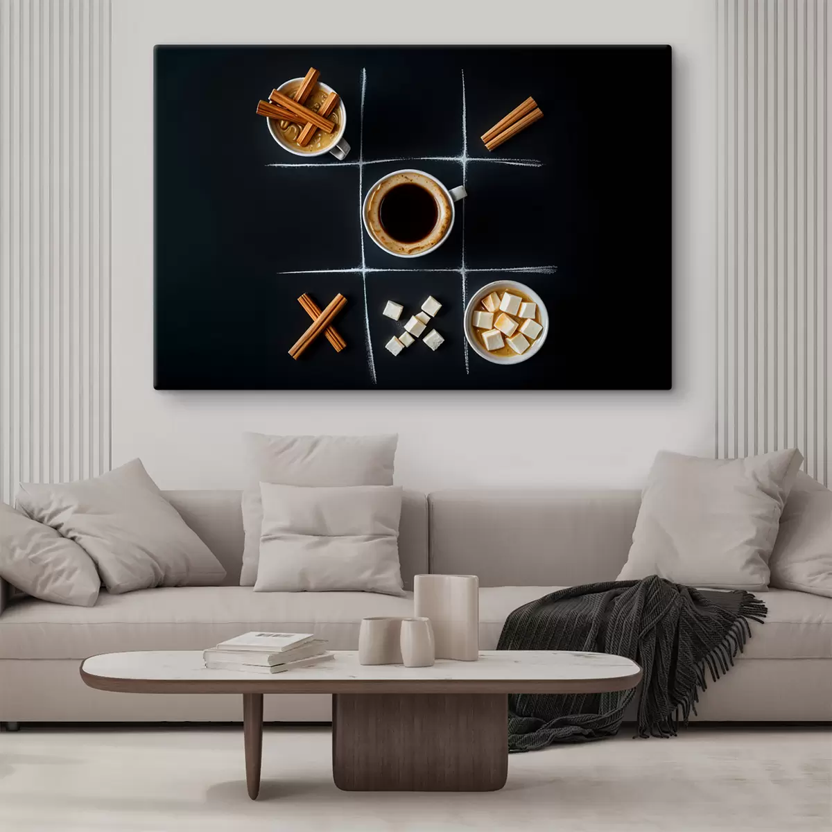 Vászonkép Egy csésze kávé fahéjrúddal, kockacukorral és mályvacukorral, tic-tac-toe rácsban Nr s40163