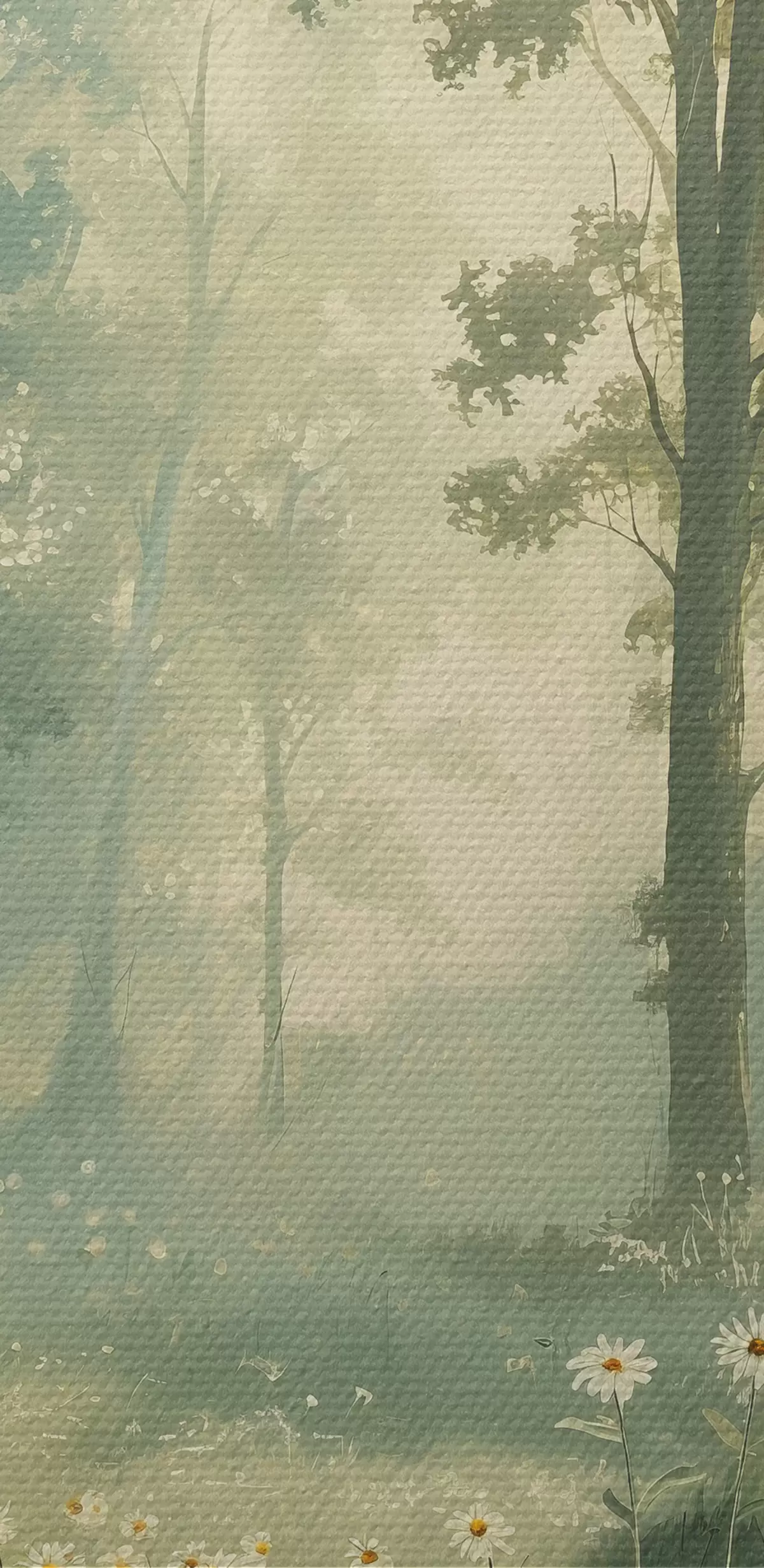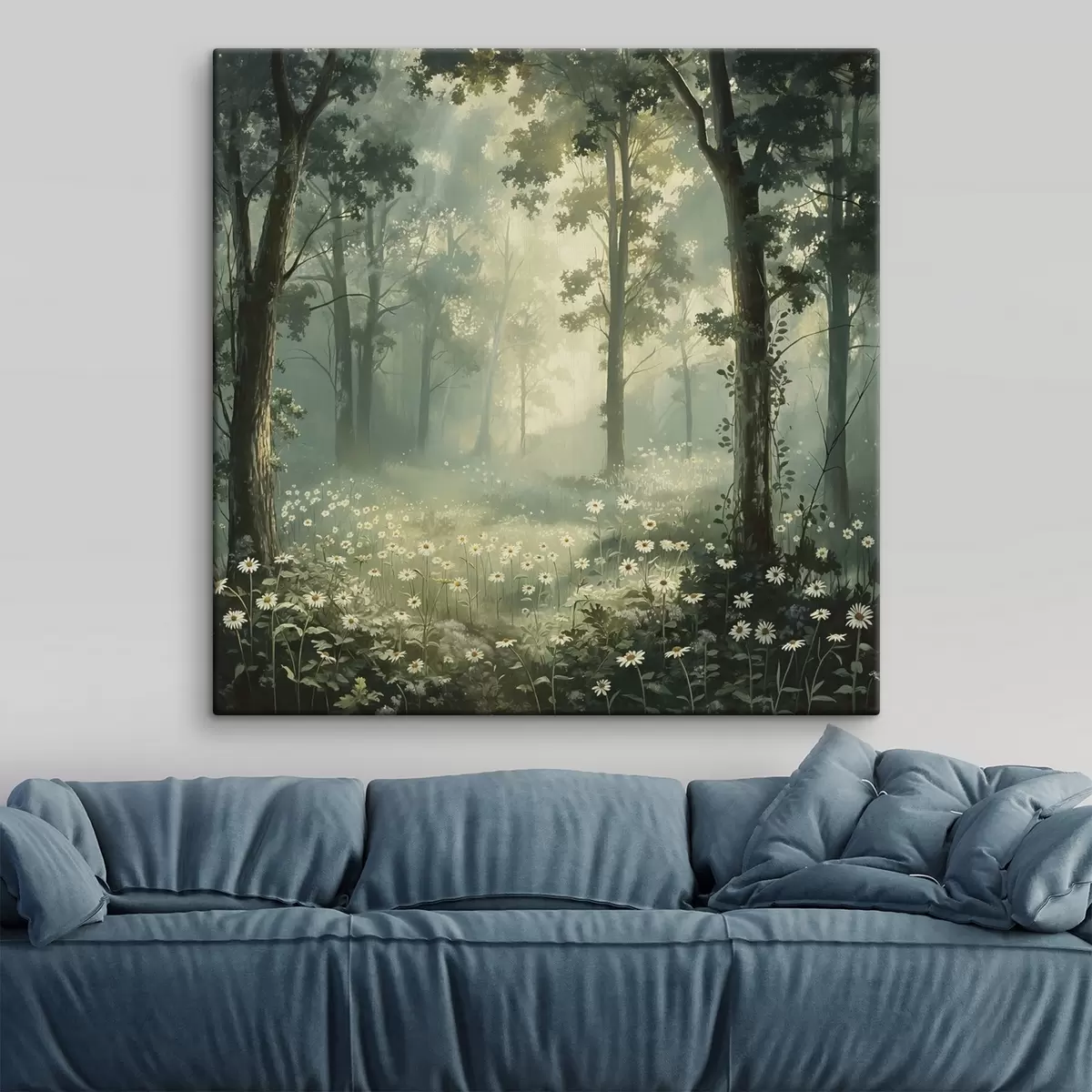 Vászonkép Erdő lágy napfénnyel, kamilla virágokkal, fákkal, zöld fűvel, akril rajzzal Nr s40228