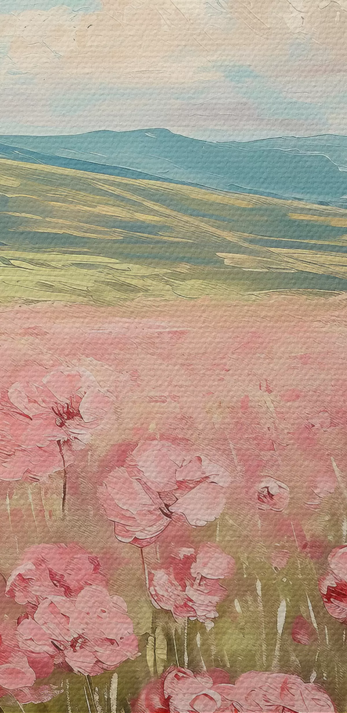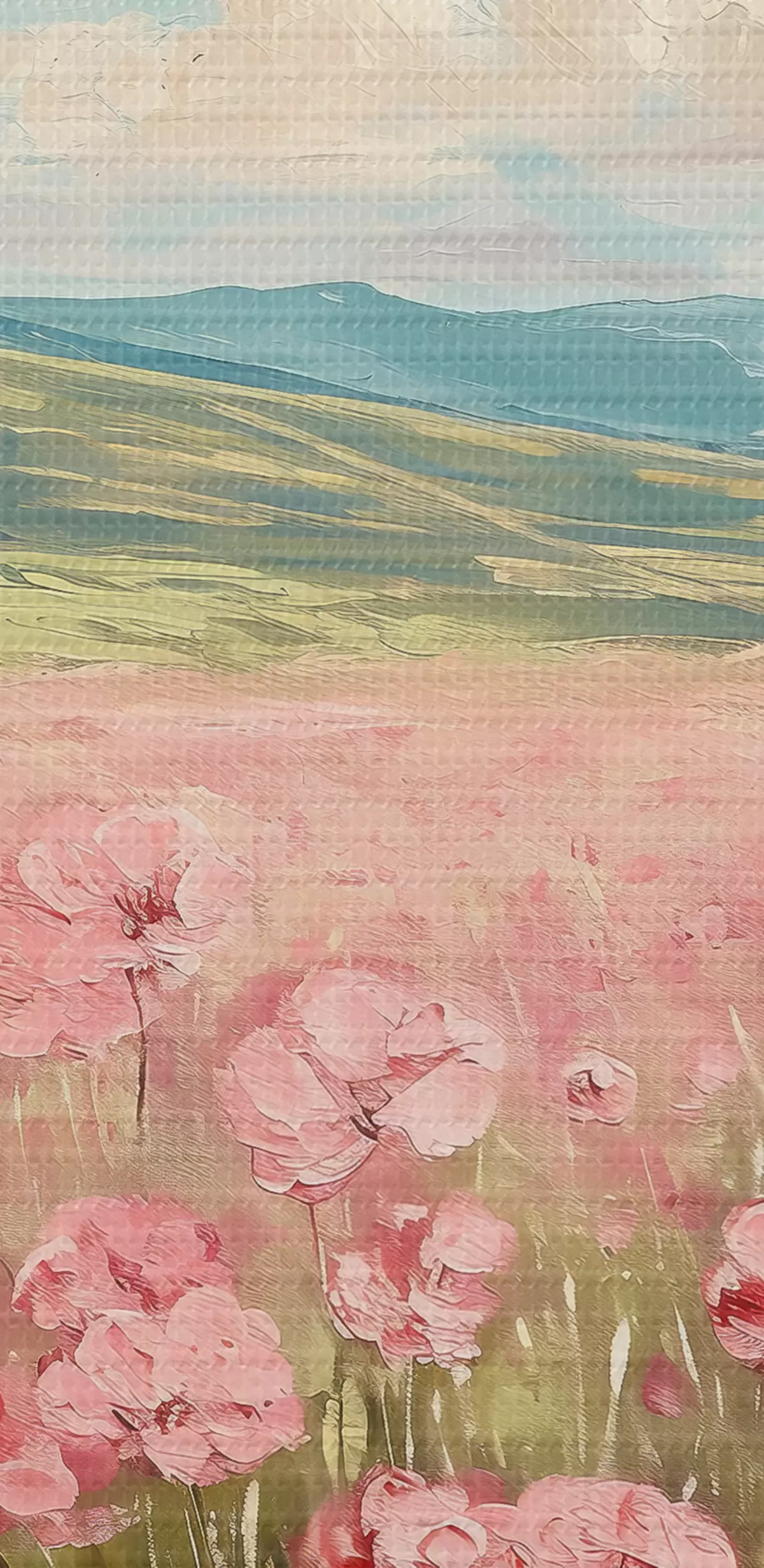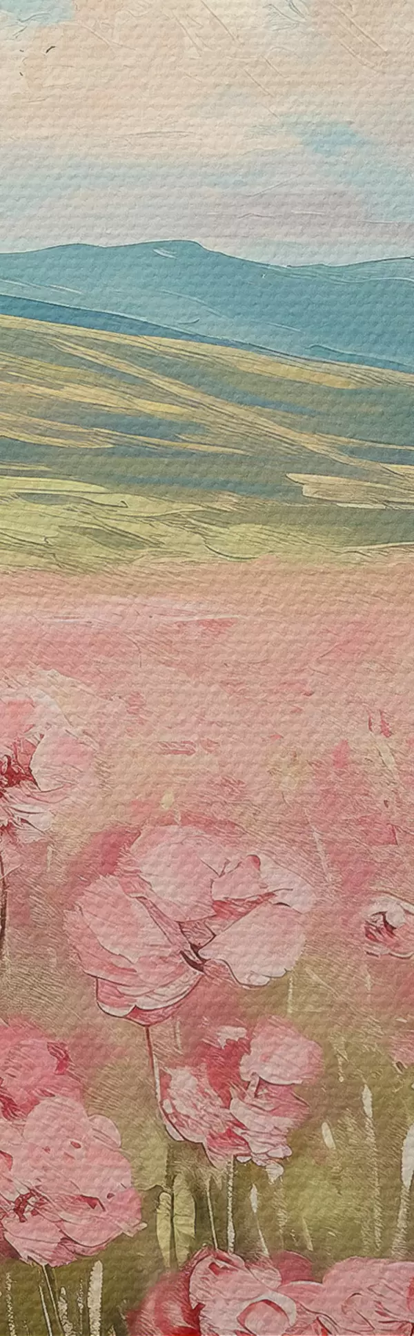 Vászonkép Rét rózsaszín virágokkal, hegyek, természeti táj, kék ég felhőkkel, akril Nr s40232