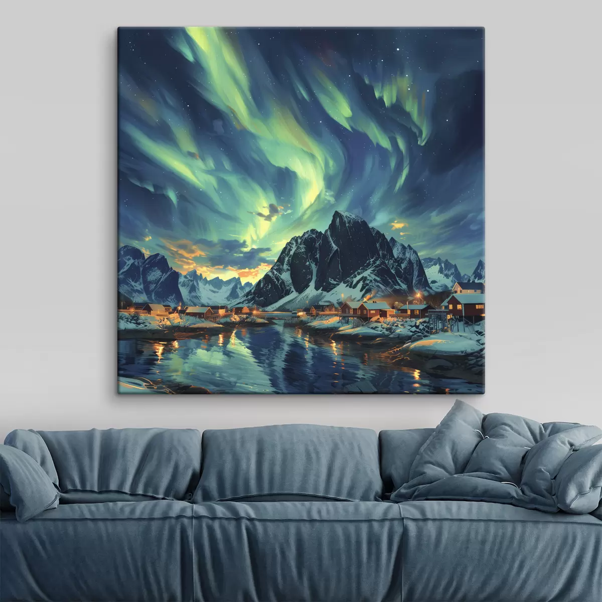 Vászonkép Lofoten szigetek, északi fények, téli falu Nr s40299