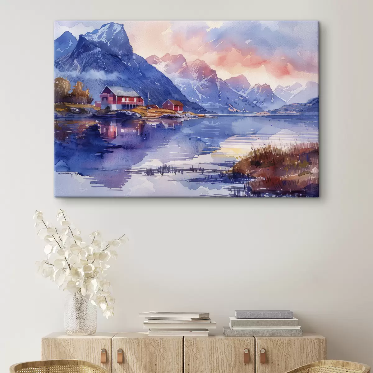 Vászonkép Norvégia falu, naplemente, nyugodt folyó, hegyek, akvarell, vízfestmény Nr s40311