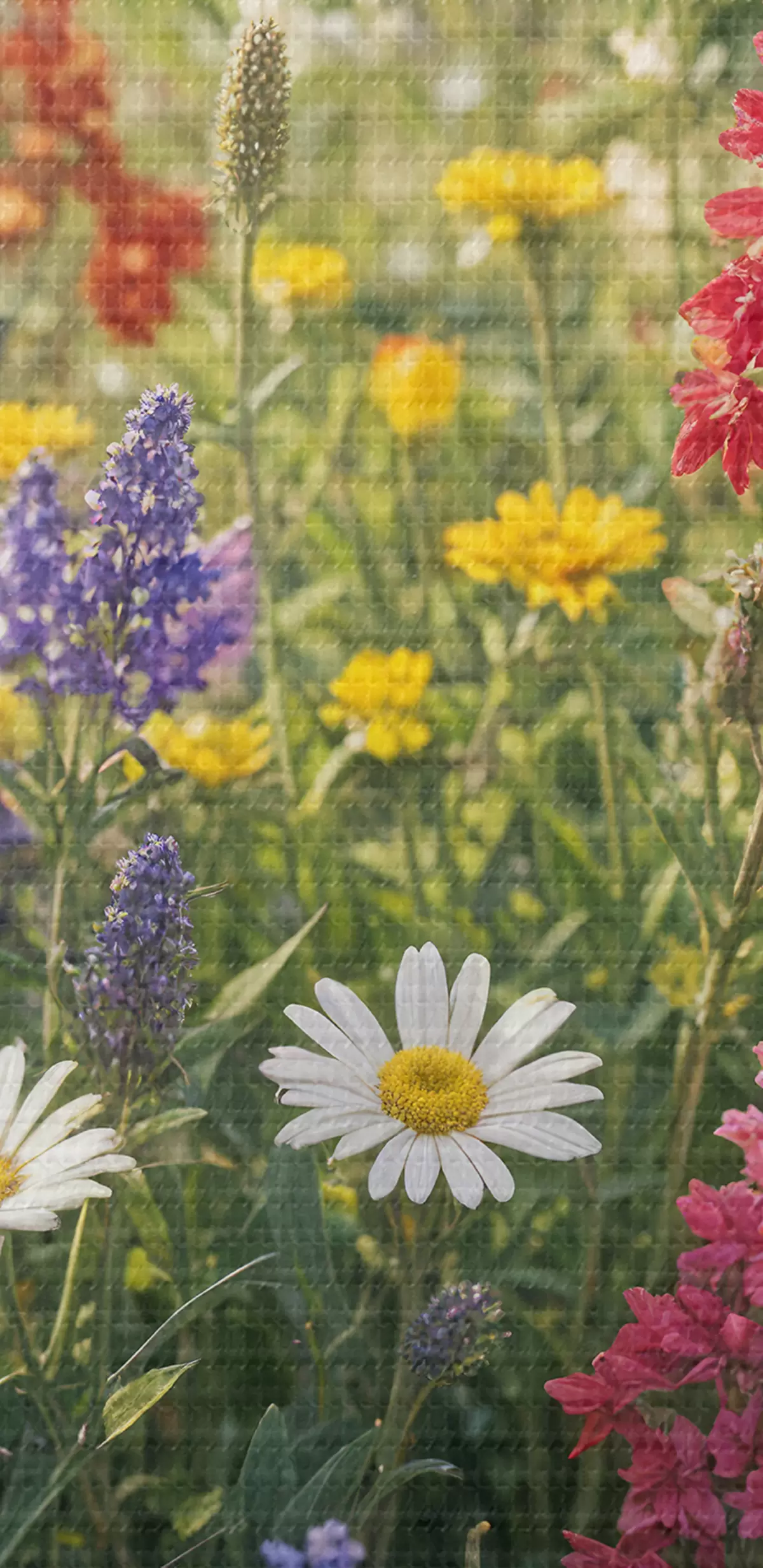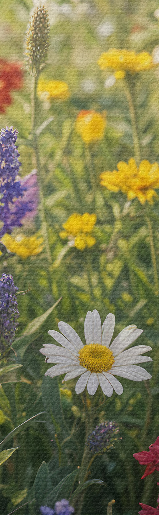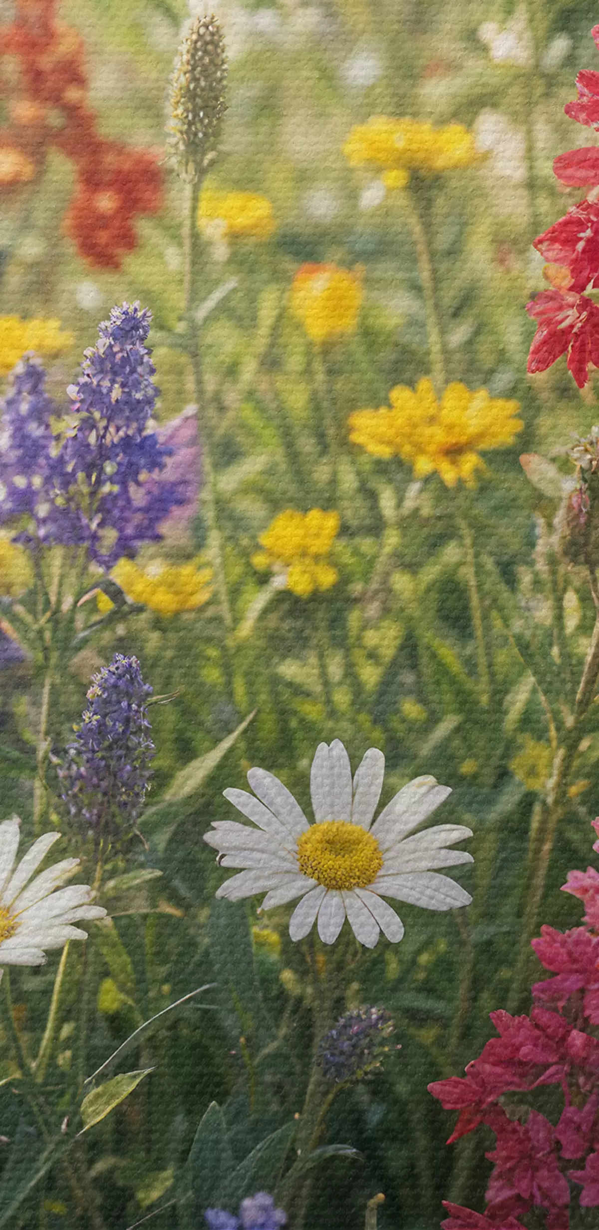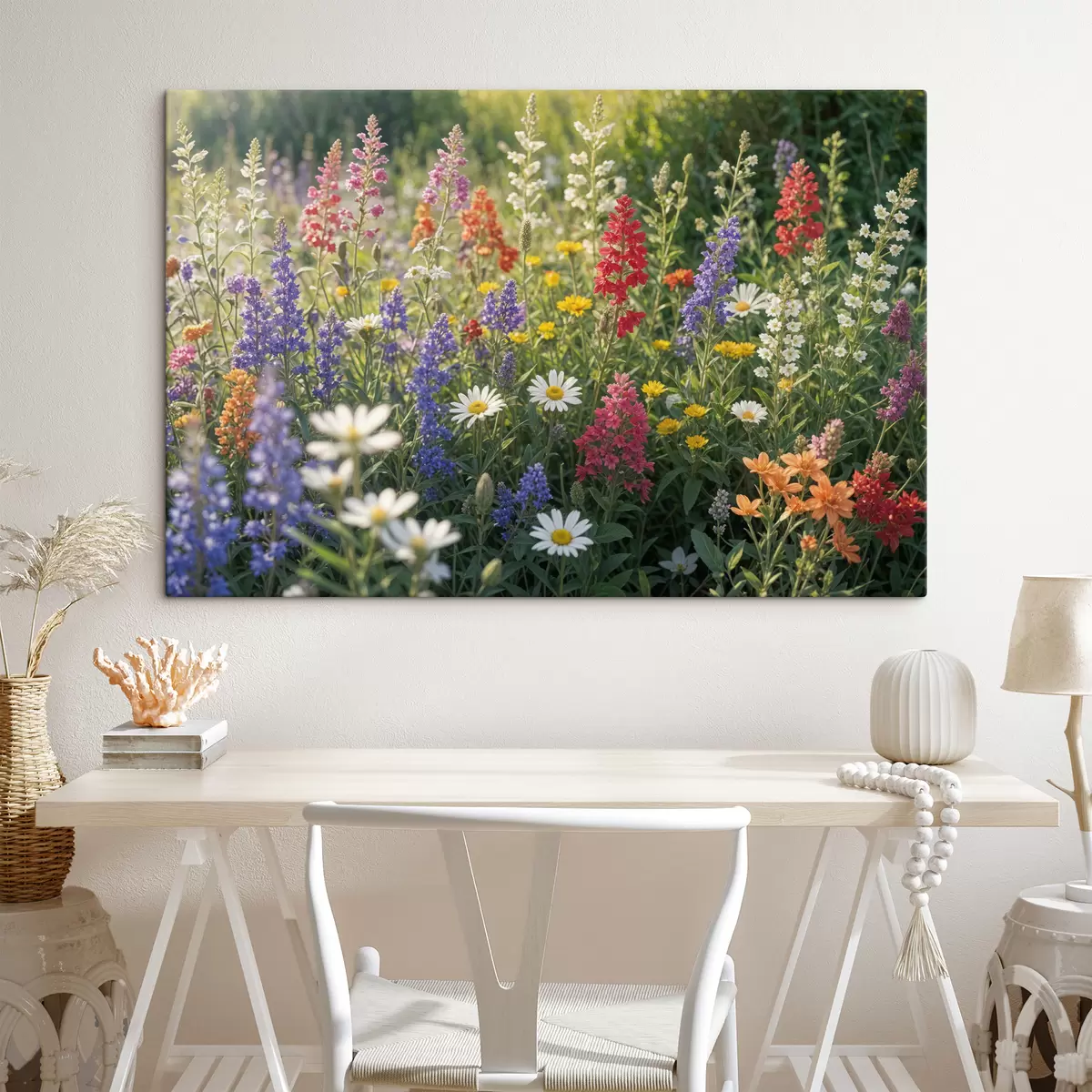 Vászonkép Színes vadvirágos rét különféle virágzó virágokkal, köztük százszorszépekkel, levendulával és piros virágokkal Nr s40390