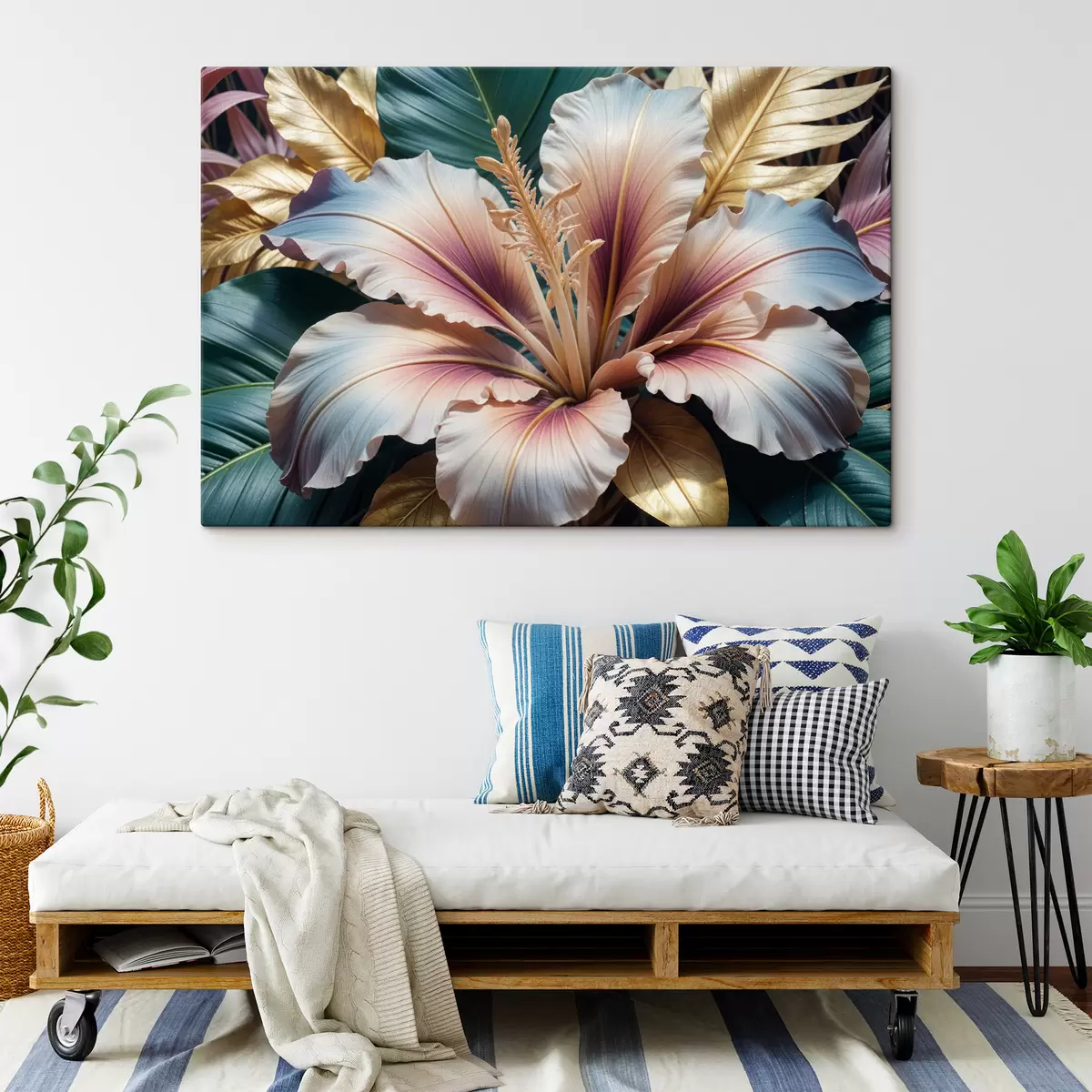 Vászonkép Élénk, sokszínű trópusi hibiszkuszvirág nagy, bonyolult szirmokkal, rózsaszín, fehér és sárga árnyalatokban Nr s40399